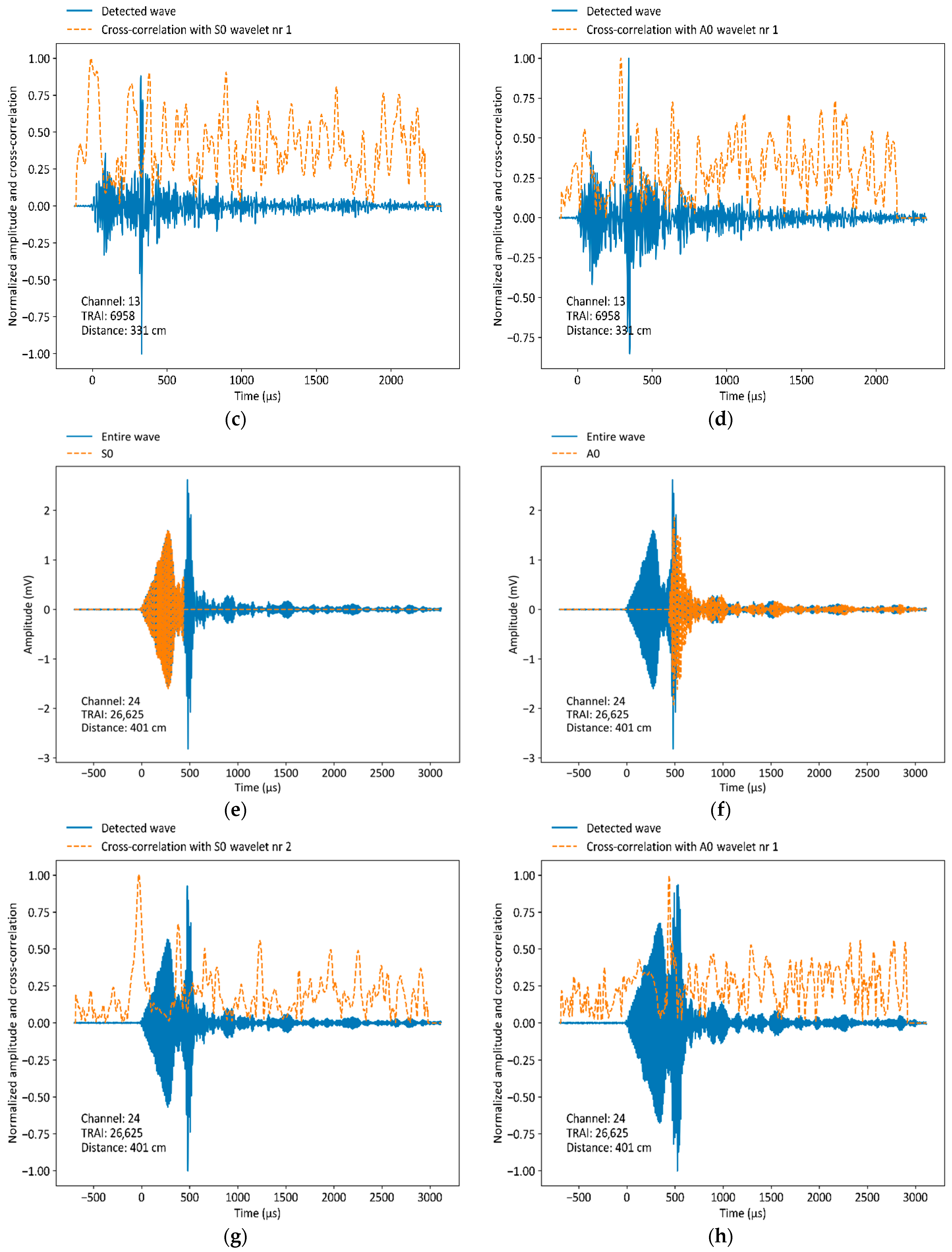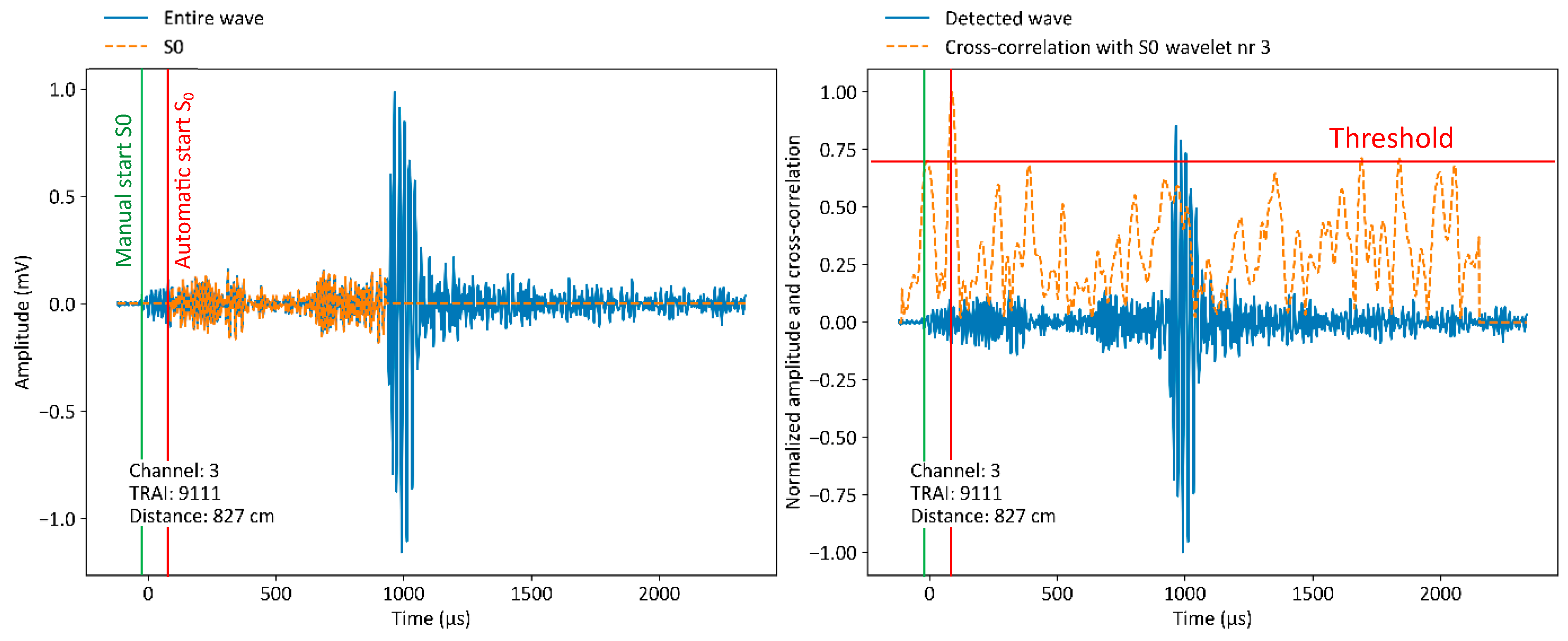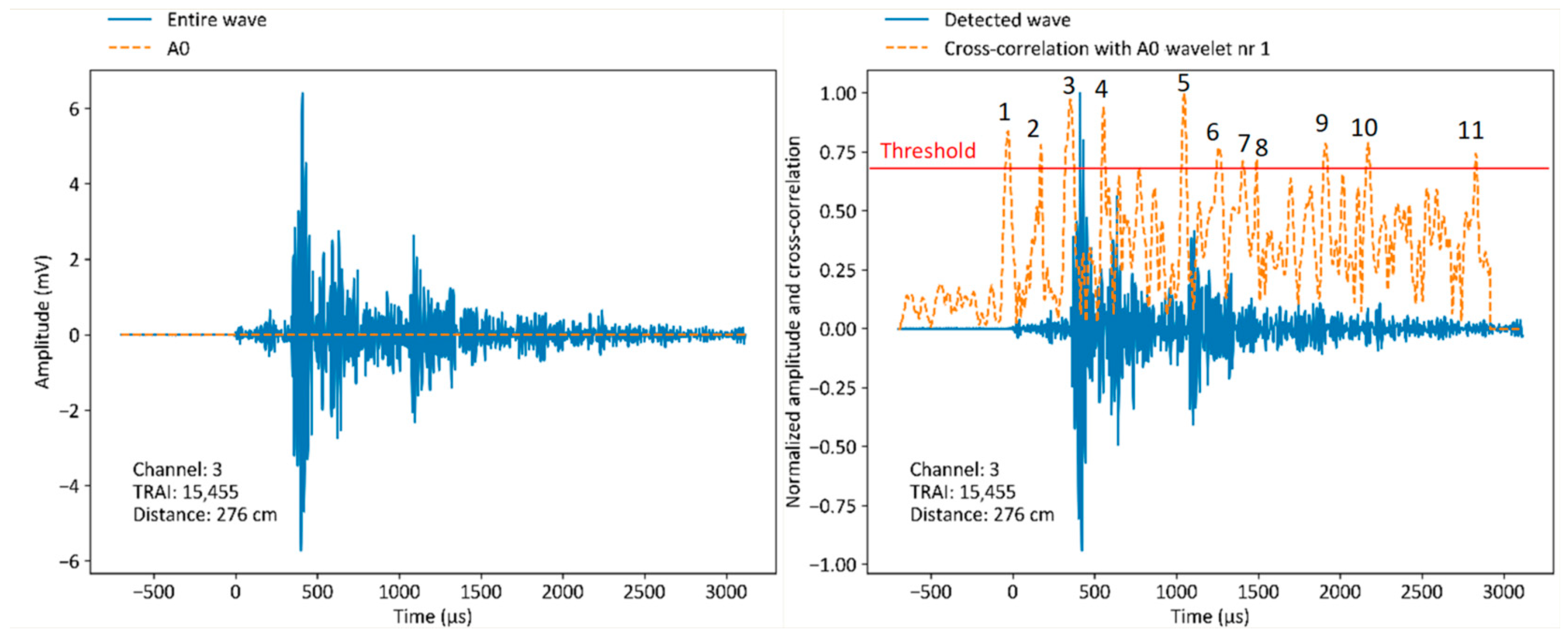 Compared to the initial method, three further adaptations have been added to this method. The reference wavelet for the A0 mode was subjected to a band-stop filter to suppress possible overlap with the S0 mode. Furthermore, the loss function for selection of a set of cross-correlation peaks has been adapted to limit the influence of strongly deviating hypothetical velocities. Additionally, a maximum number of cross-correlation peaks after filtering has been set to limit the number of possible combinations and thereby also to limit the probability of coincidentally matching hypothetical velocities.