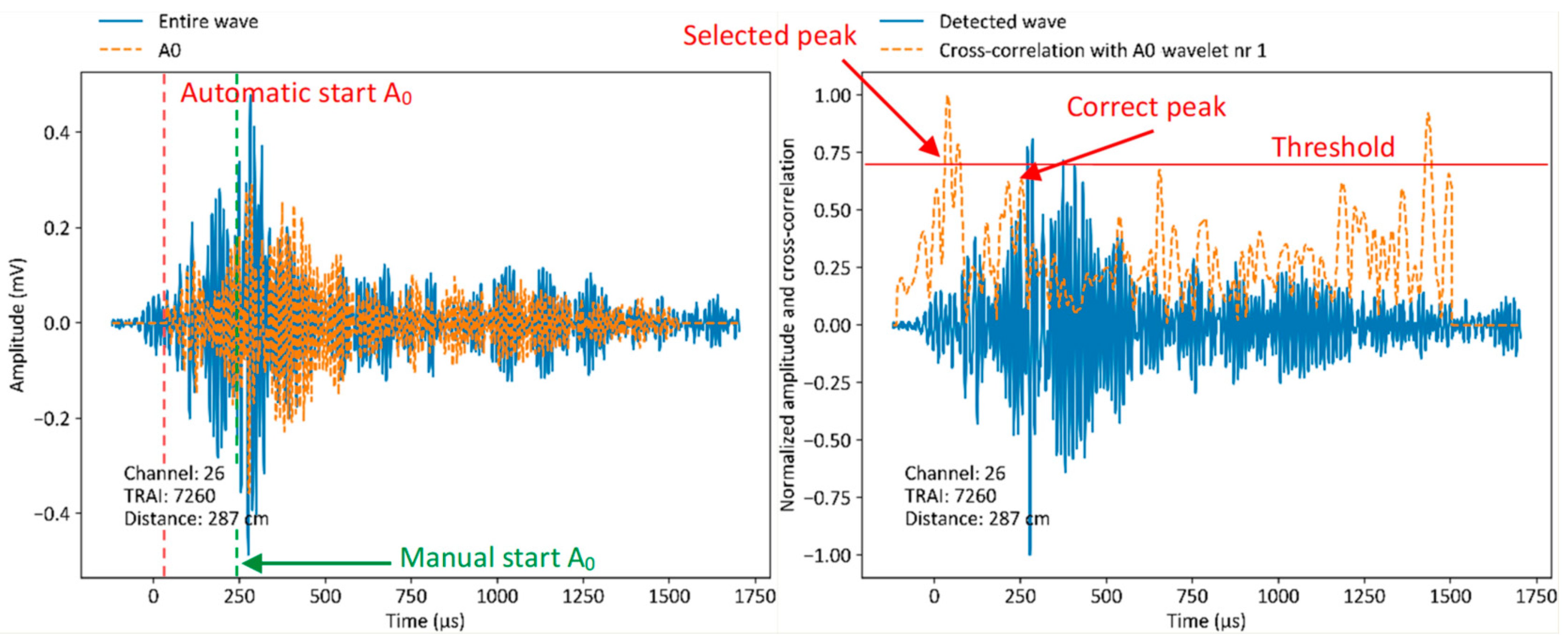 When combined, the errors due to a too low magnitude of the best cross-correlation peak and those due to too many peaks represent 49% of the overall error count. Although different in effect, they both have a poor match between the wavelet and the targeted mode as the root cause. In the case of too many cross-correlation peaks, an alternative cause could be a high number of repetitions of the same mode in the signal. However, more than two repetitions were not observed in any signal in the studied dataset. Errors due to too many cross-correlation peaks may be further limited by reducing the considered time range. This, however, may come at the cost of an increased probability to partially or entirely exclude one mode from the considered time range, depending on the possible propagation distances.