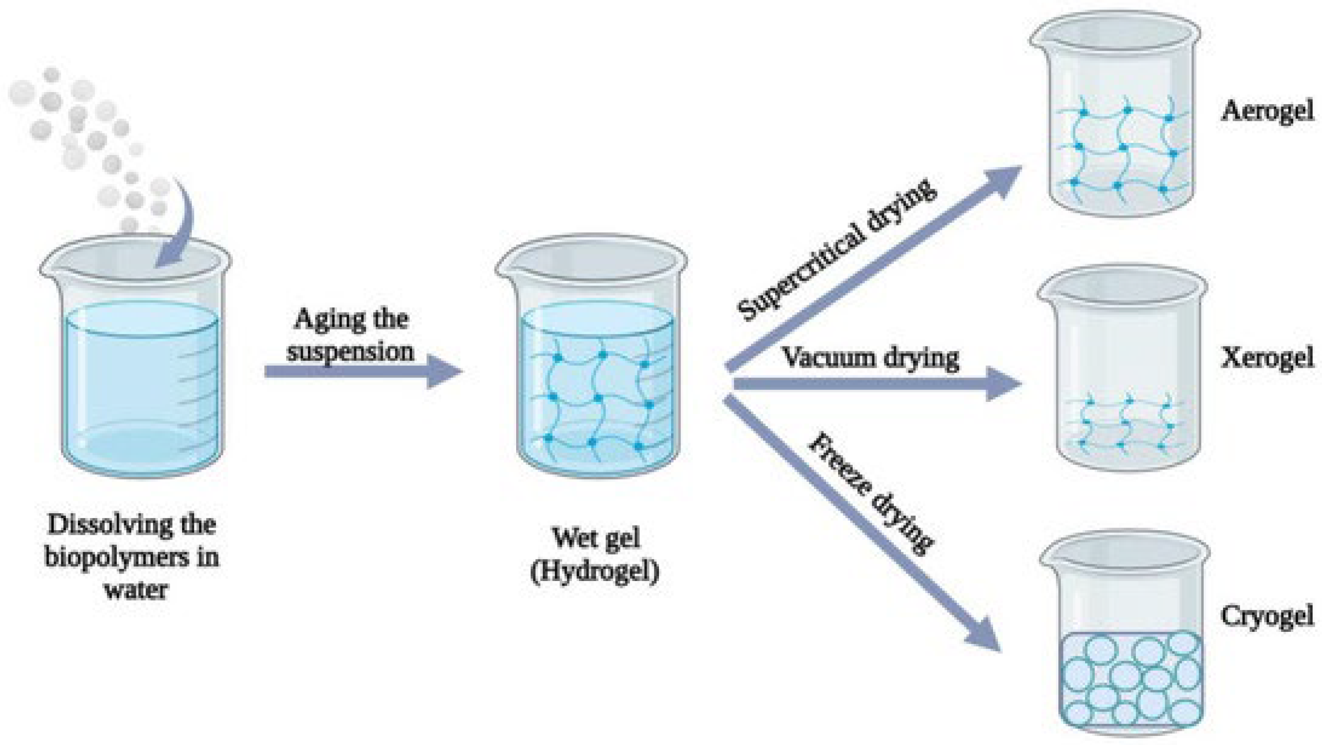 | Aerogel | Air | Evaporative drying at ambient conditions/freeze-drying (lyophilization) after freezing/supercritical drying (extracting liquid at high pressure). | Dense, low porosity due to structural collapse/large interconnected pores (macroporous), mechanically stable/Ultra-light, highly porous, best OBC. |