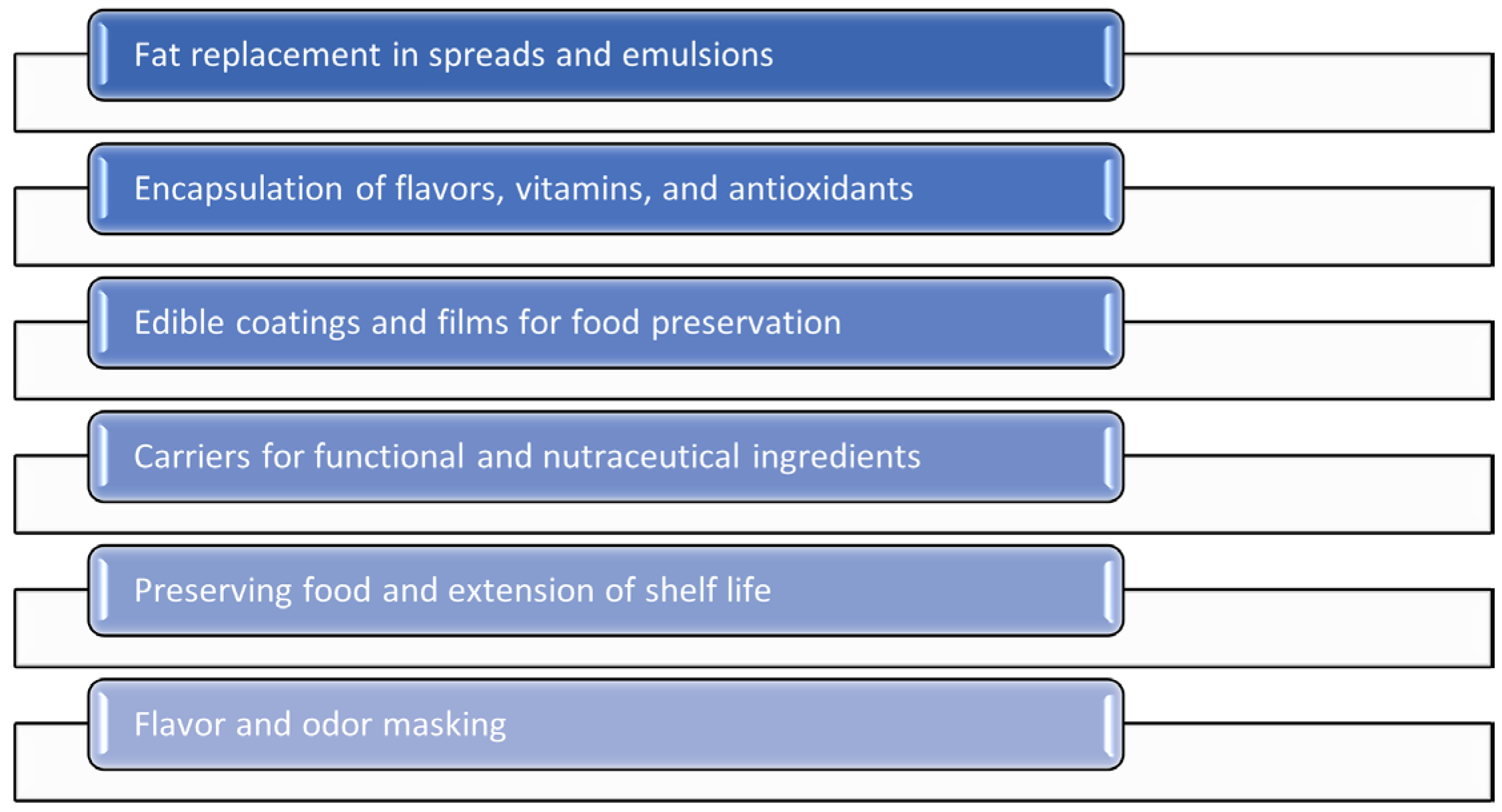 | Glycerol monostearate | Excellent ability to retain oil | 5 | Hazelnut spread | [50] |