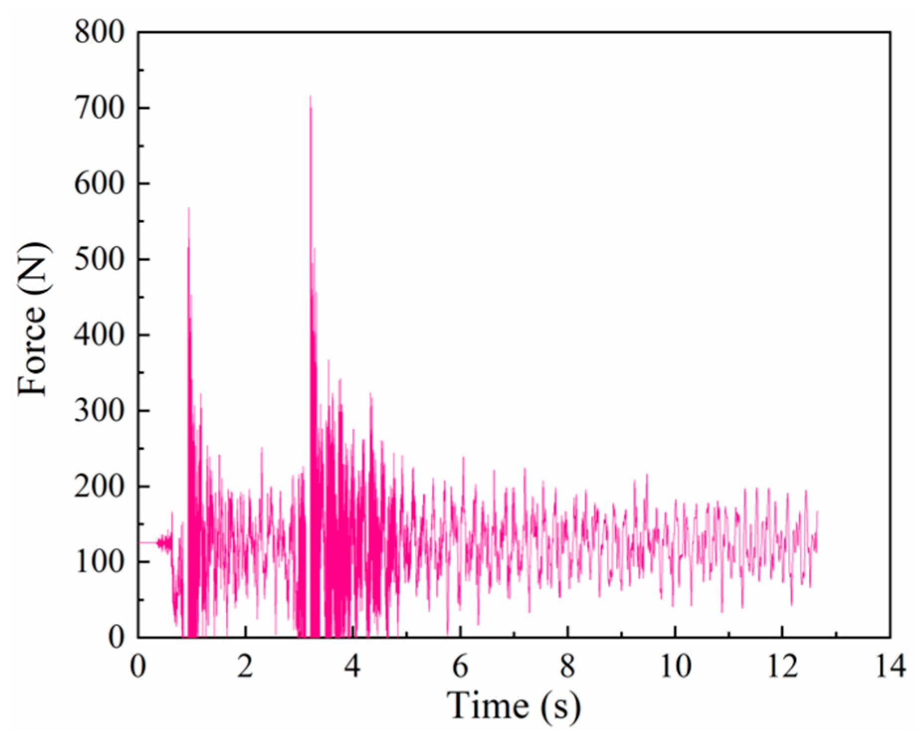 - The normal stress field remained in dynamic equilibrium during continuous peeling of the interfacial material, while the tangential slip amplitude exhibited a time-dependent expansion characteristic. The damage depth and cycle count follow an approximately linear development pattern in the 103–104 interval, but exhibit a weak super-linear growth trend at high cycle stages (N > 5000).
