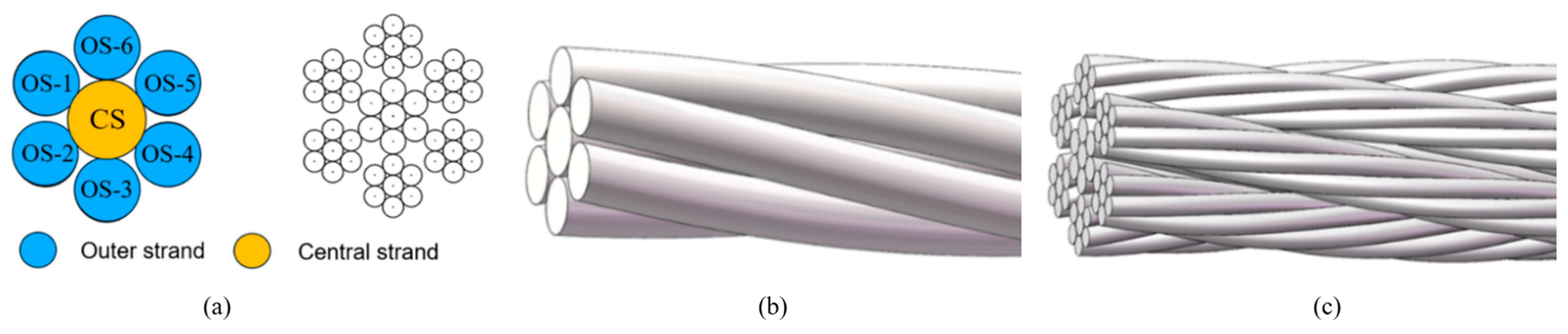 - Liu, L.; Zheng, S.; Liu, D. Effect of lay direction on the mechanical behavior of multi-strand wire ropes. Int. J. Solids Struct. 2020, 185–186, 89–103. [Google Scholar] [CrossRef]