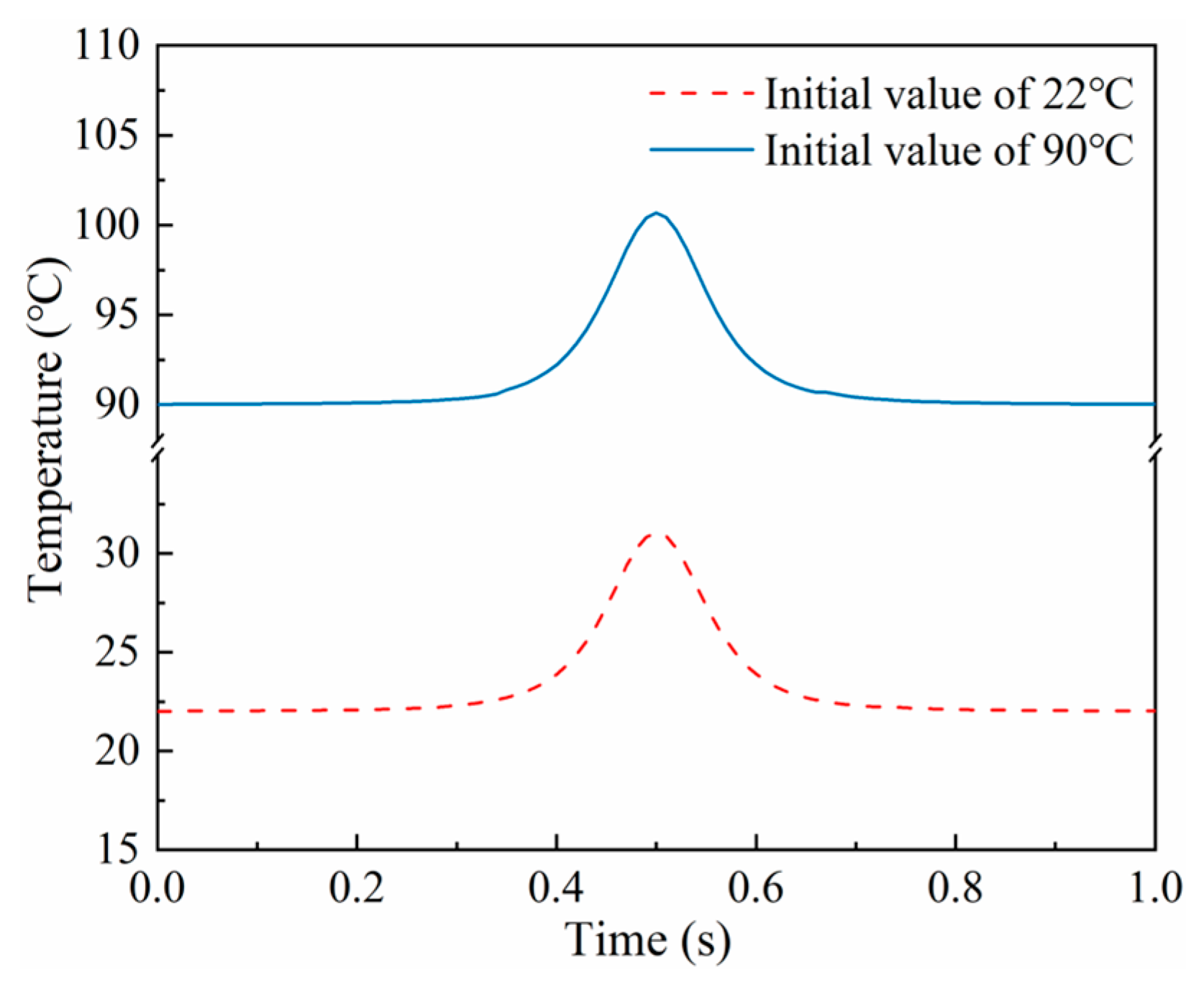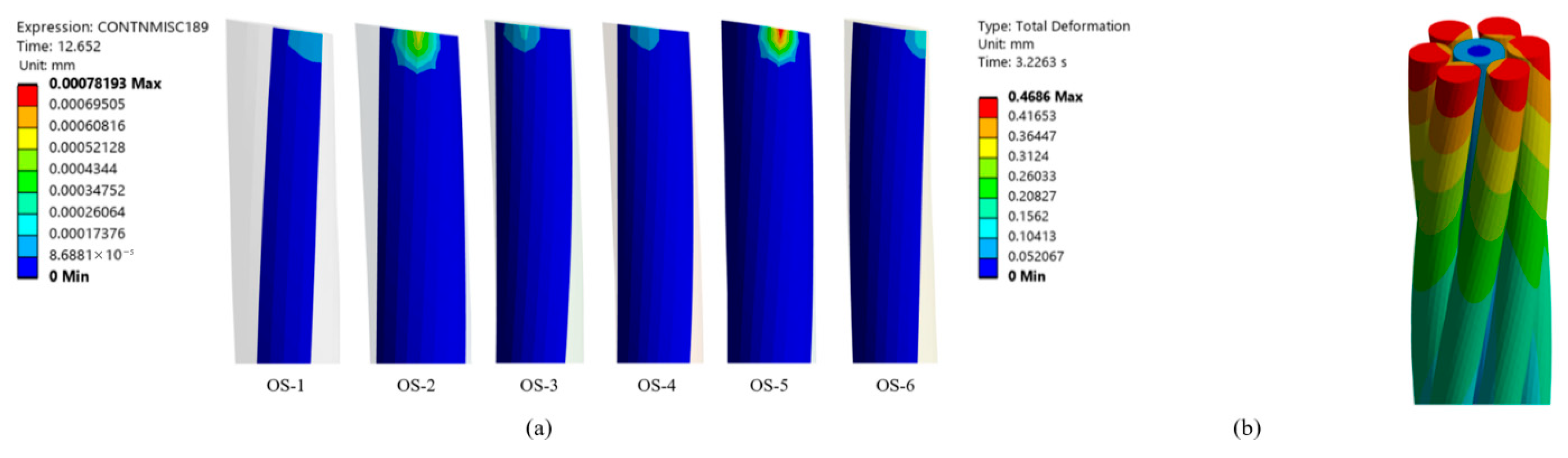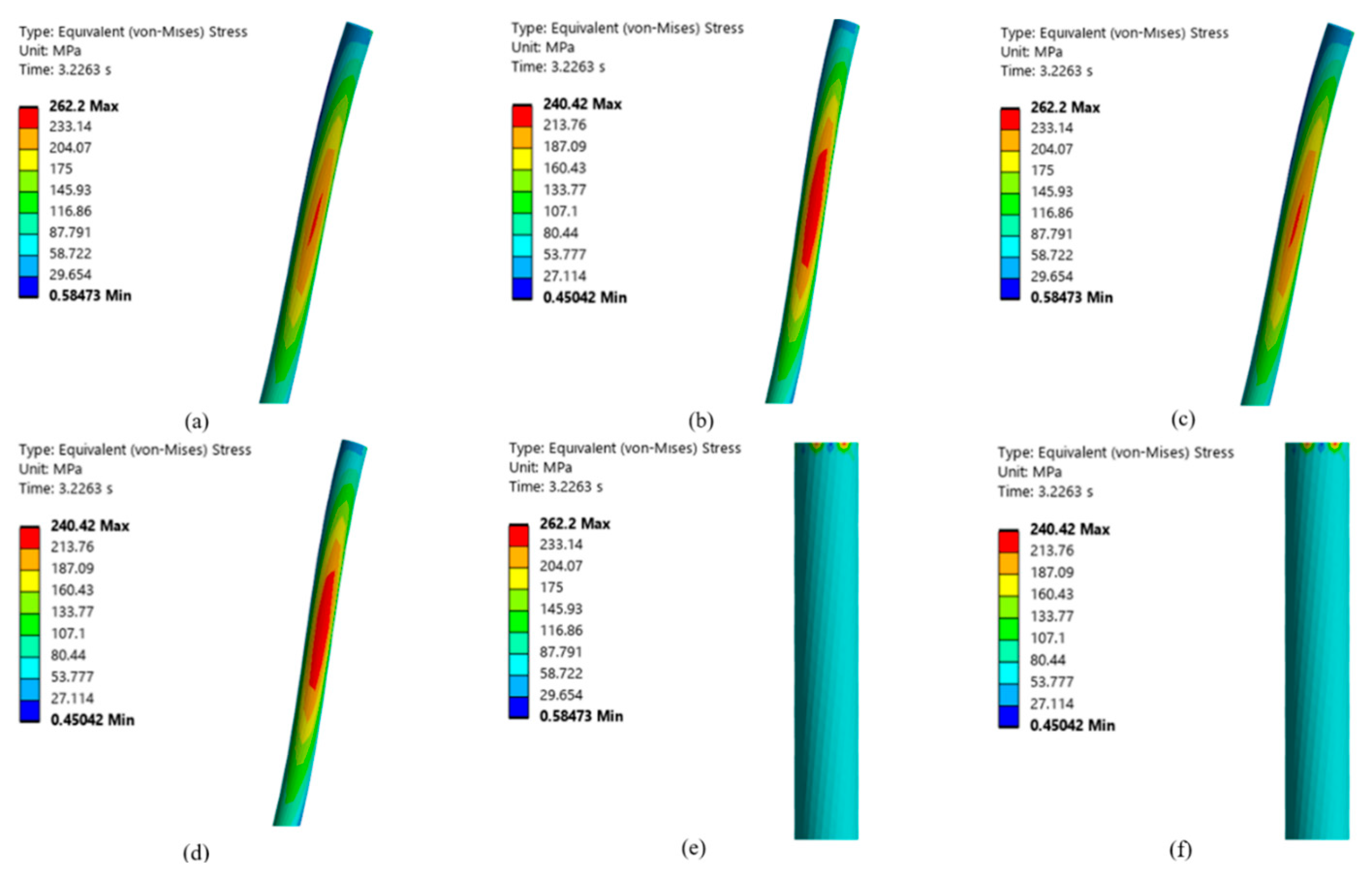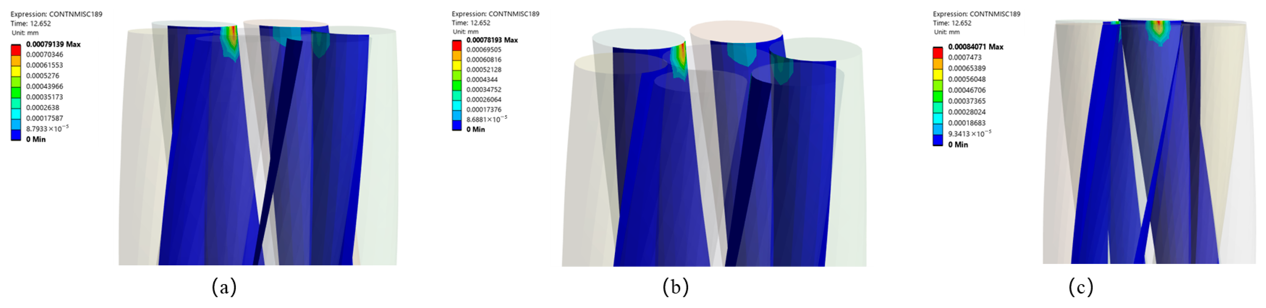 - The material softening effect due to temperature loading (a decrease in elastic modulus by about 4%) did not significantly change the system’s maximum stress level, the stress level is primarily governed by the external loading and the local contact geometry, while the reduction in Young’s modulus mainly manifests as decreased structural stiffness and increased deformation, with only a minor effect on the stress magnitude.