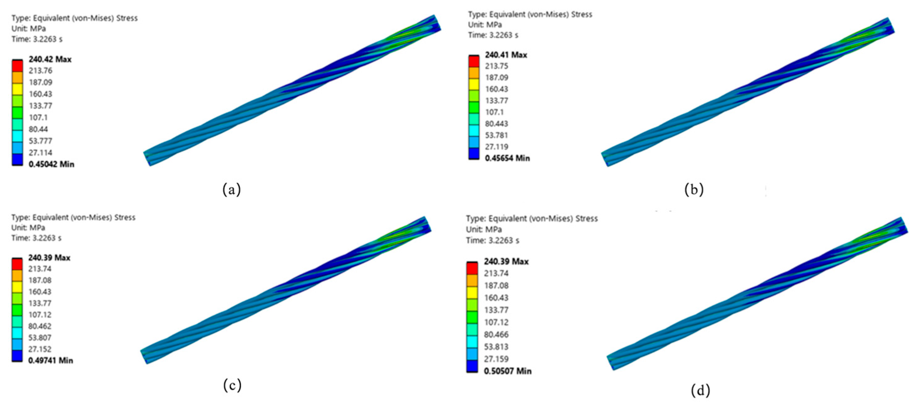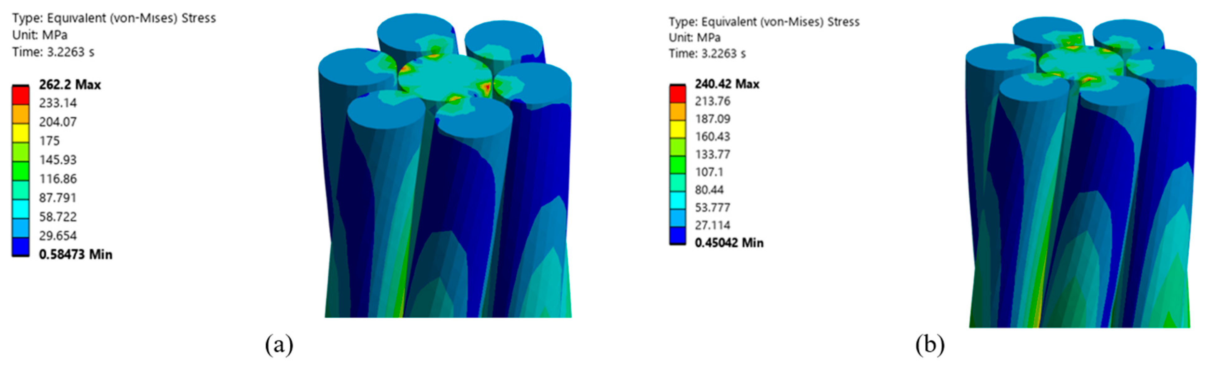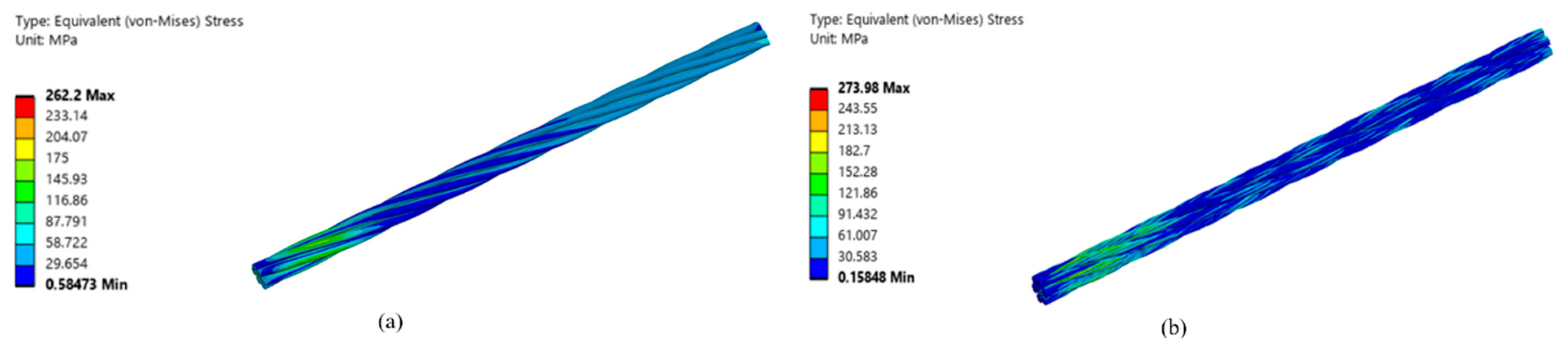 - This study established a numerical framework that integrated an Archard-based dynamic wear law with transient three-dimensional strand–strand contact analysis in ANSYS Workbench. A nonlinear frictional-contact algorithm was used to capture realistic interstrand interactions under service conditions.