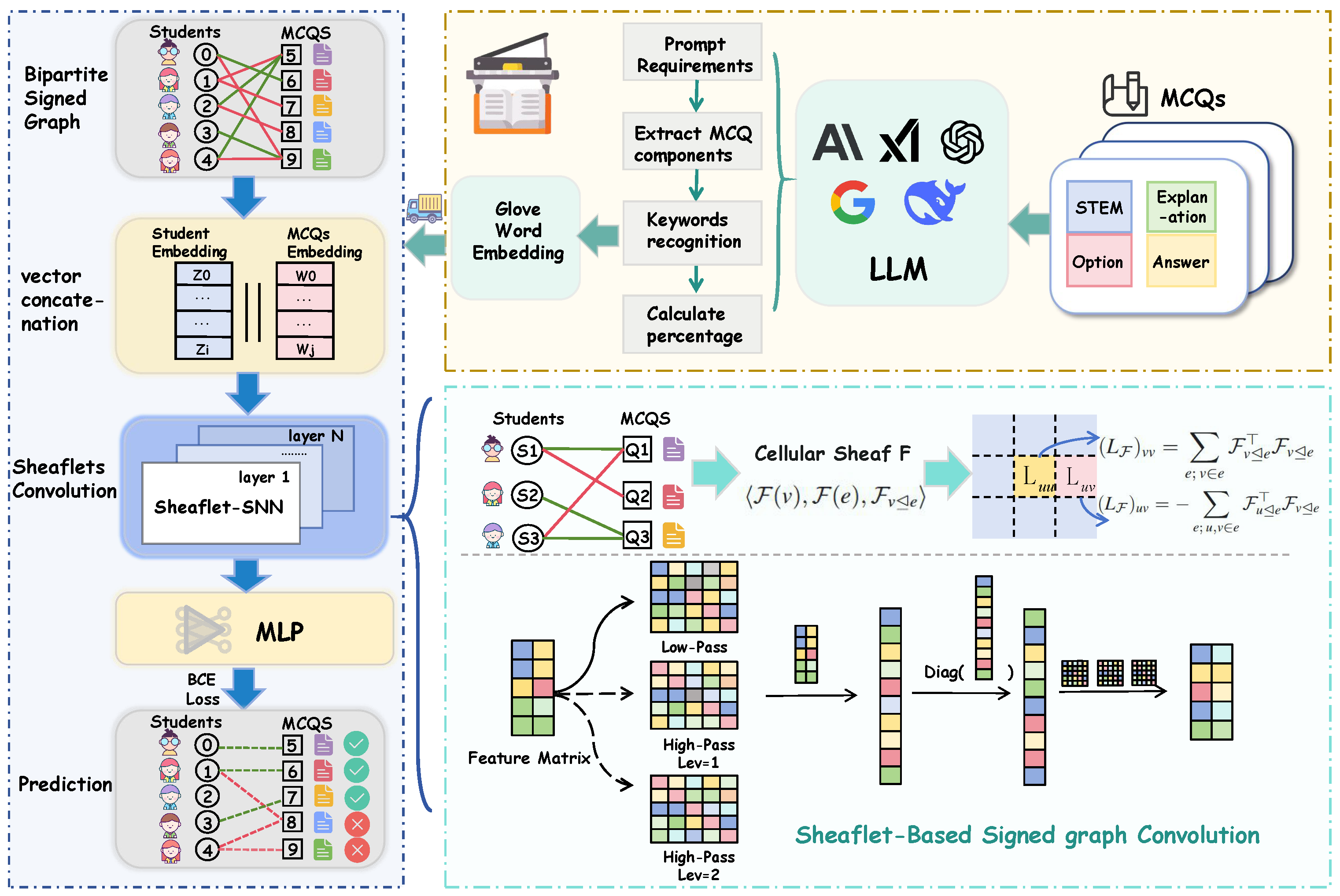 LLM-based Semantic Extraction. In the EduSheaf framework, we leverage large language models to enrich the semantic representation of multiple-choice questions. Specifically, question stems, options, and explanations are reformulated into structured sentences, from which the LLM extracts key concepts and their associated weights. These are then combined with GloVe embeddings to generate weighted semantic representations. By integrating this semantic information with the structural features of signed graphs, we obtain more comprehensive node embeddings that enhance prediction performance. Compared with traditional approaches, this strategy effectively addresses the underutilization of semantic cues in MCQ representation and introduces a novel perspective for fusing textual and graph-structured data in educational contexts.