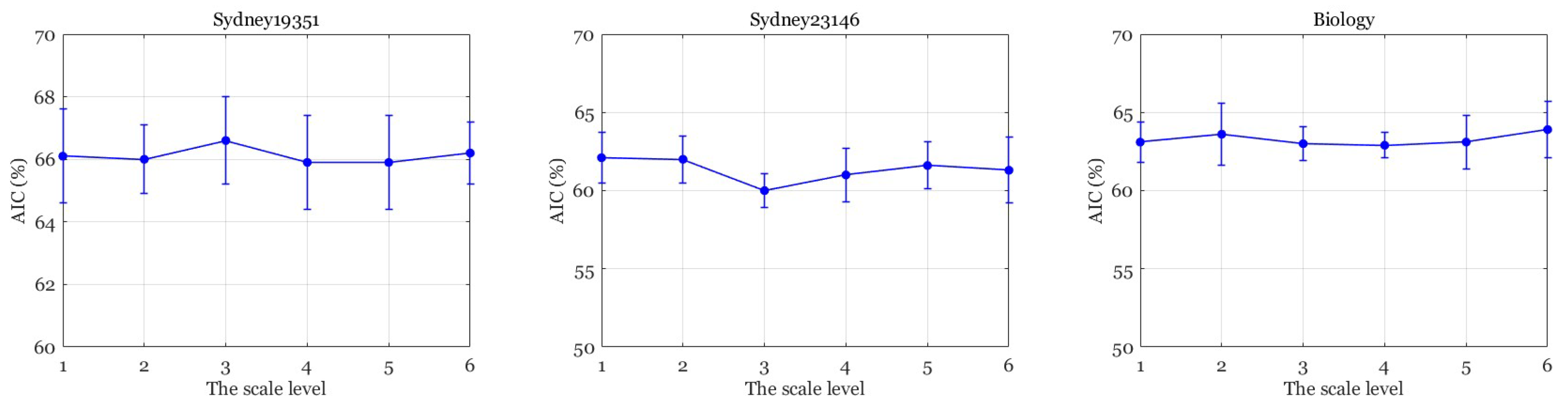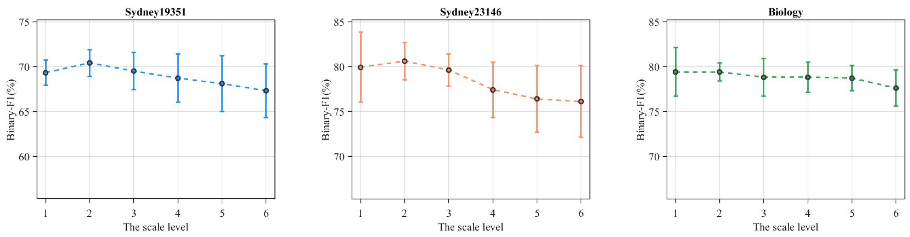 In the experimental setup, the scale level was varied from 1 to 6, and its influence was assessed across three representative datasets—Sydney19351, Sydney23146, and Biology. The results, summarized in
