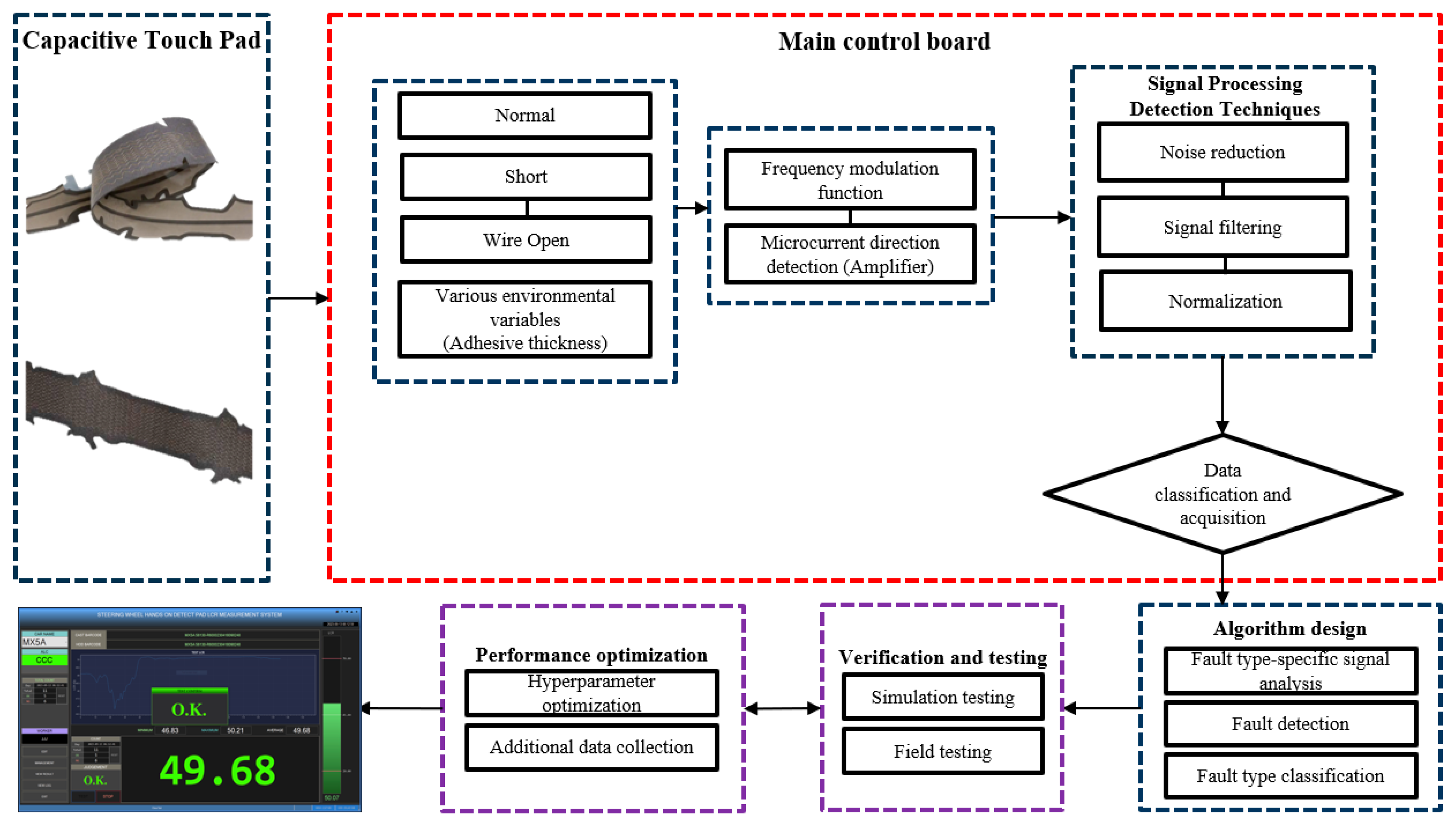 Despite these requirements, research on capacitive-based HOD systems has predominantly focused on improving hand detection accuracy, contact position recognition, or sensor fusion with vehicle dynamics and driver-related signals. Within this research trend, the capacitive touch pad itself—despite being the core sensing component of HOD systems—has rarely been examined from the perspective of fault or defect detection. Most prior studies implicitly assume fault-free operation of the touch pad, while systematic investigations into manufacturing-induced defects, such as electrode disconnections, coating failures, or internal structural abnormalities, remain limited. Moreover, real-time diagnostic frameworks specifically designed to detect capacitive touch pad defects during the production process have not been sufficiently explored in the existing literature.