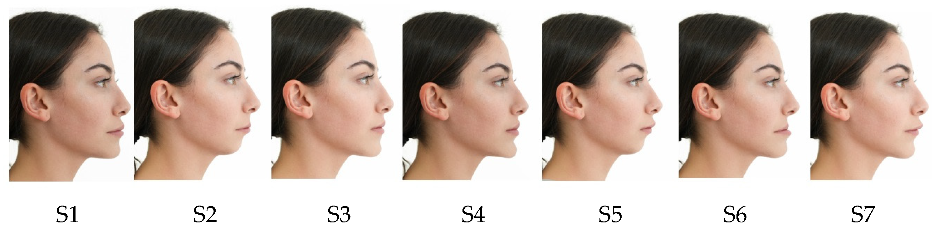 The volunteer participant had no clinically significant facial asymmetry and no scars, tattoos, or piercings. Photographs were captured in a professional studio using a Nikon D3200 SL-102C camera, with a natural head position maintained, the Frankfort horizontal plane oriented parallel to the ground, lips at rest, and teeth in maximum intercuspation. The original profile image was subsequently modified using Adobe Photoshop CC 2024 (Version 25.0) to create seven malocclusion-based facial profile types: mandibular prognathism, maxillary protrusion, maxillary retrusion, bimaxillary retrusion, mandibular retrognathism, straight profile, and bimaxillary protrusion. Participants rated seven malocclusion-based facial profile silhouettes (S1–S7) using a 1–7 visual analog scale (VAS), on which 1 represented the “least attractive” and 7 the “most attractive” profile. The profiles consisted of the following types: S1, bimaxillary protrusion (maxilla and mandible forward); S2, bimaxillary retrusion (maxilla and mandible backward); S3, straight profile; S4, mandibular prognathism (mandible forward); S5, mandibular retrognathism (mandible backward); S6, maxillary retrusion (maxilla backward); and S7, maxillary protrusion (maxilla forward) (