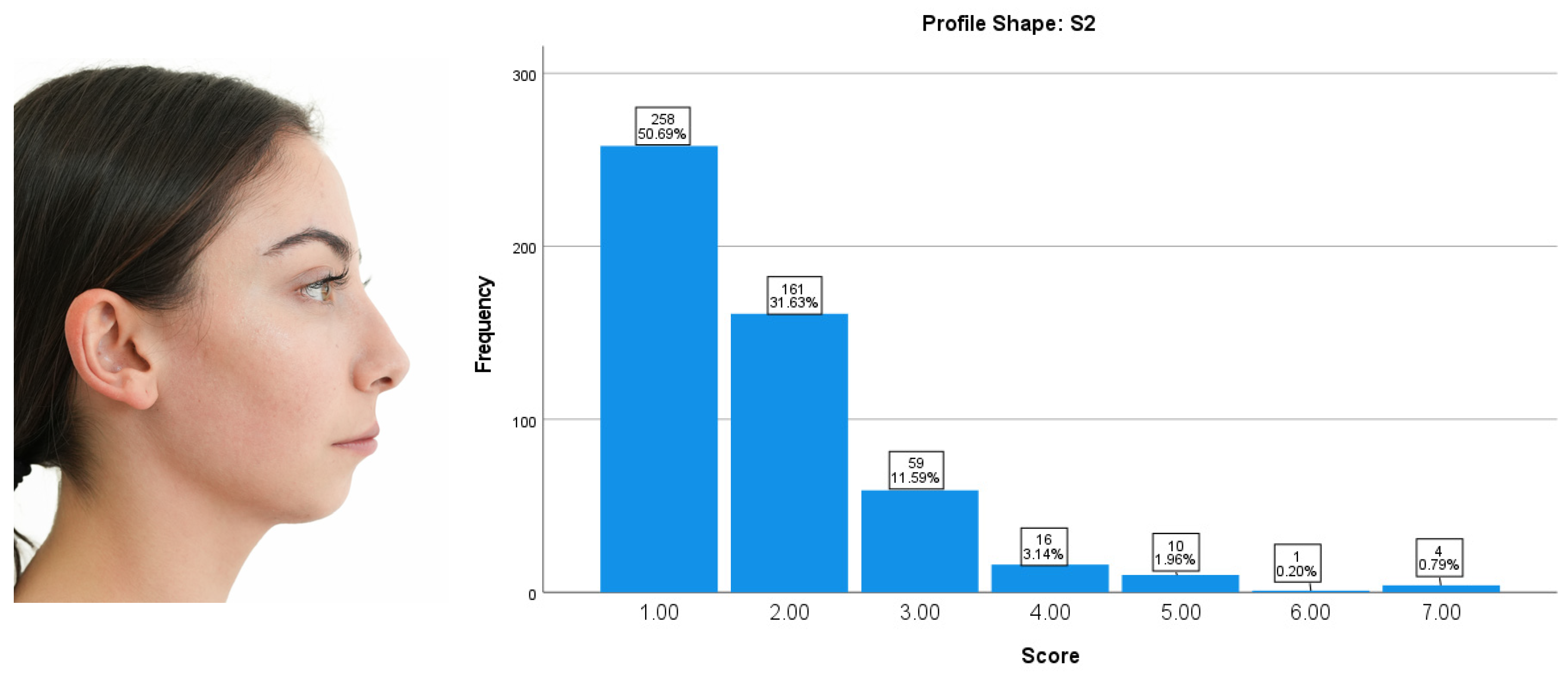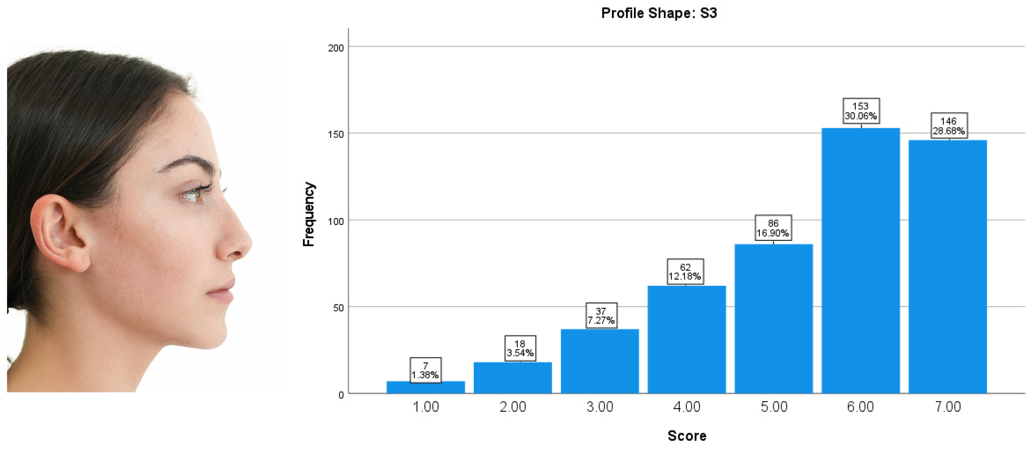 The participants’ ratings for Profile Shape S2 were predominantly concentrated at the lower end of the attractiveness scale. A score of 1 was the most frequently assigned value (50.69%), followed by 2 (31.63%). Mid-range attractiveness scores (3–5) accounted for a small proportion of responses, while higher scores (6–7) were rarely assigned. Overall, Profile Shape S2 was perceived as unattractive, indicating a consistent tendency toward negative aesthetic evaluations (