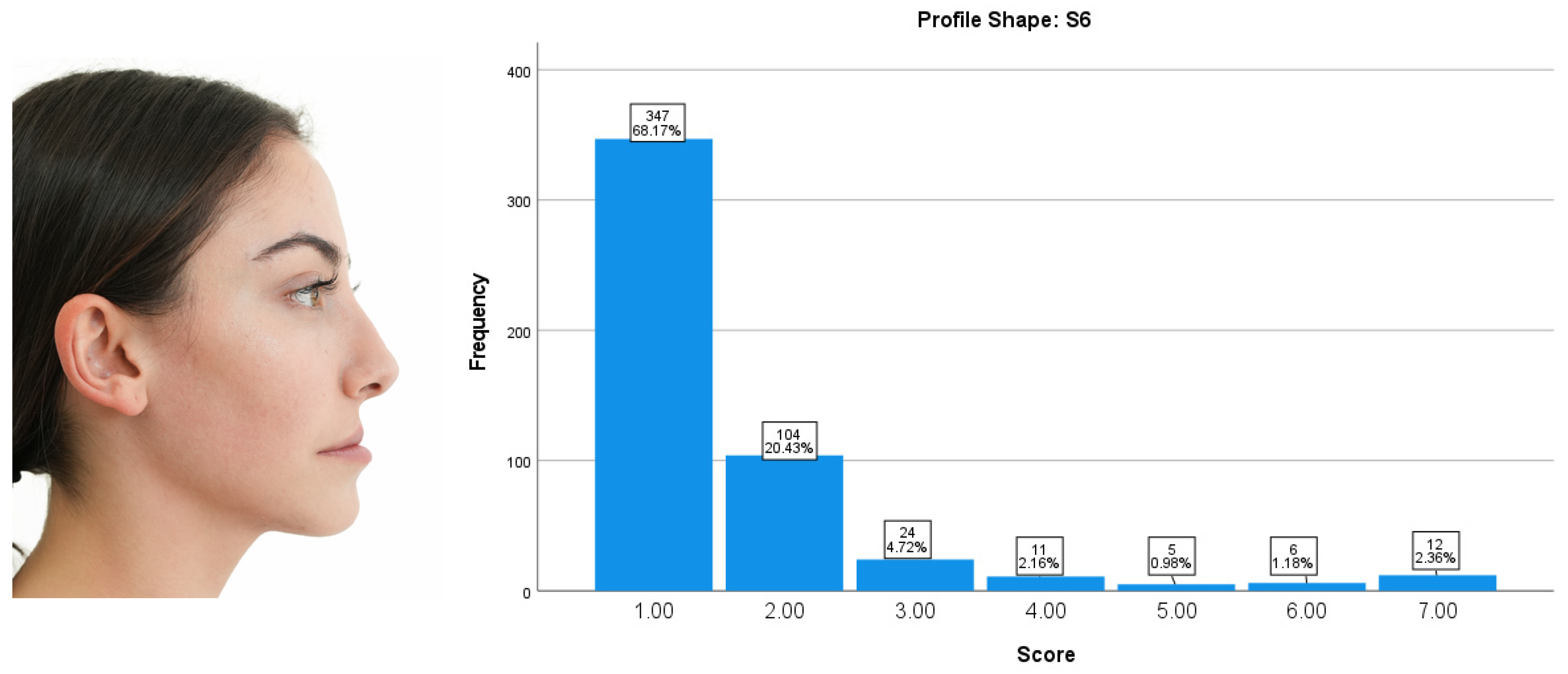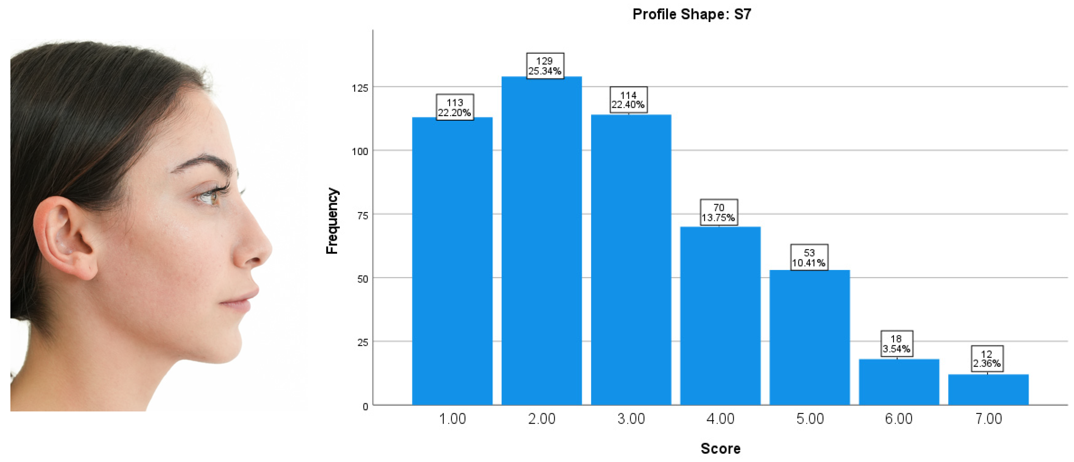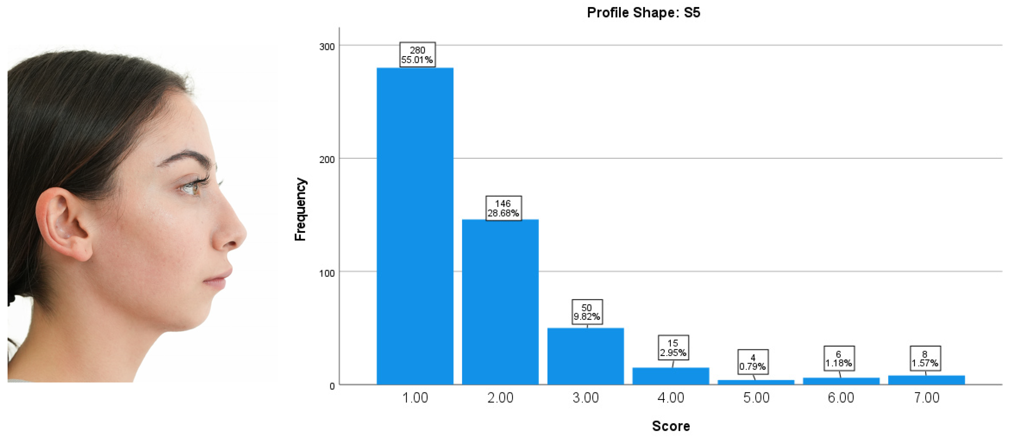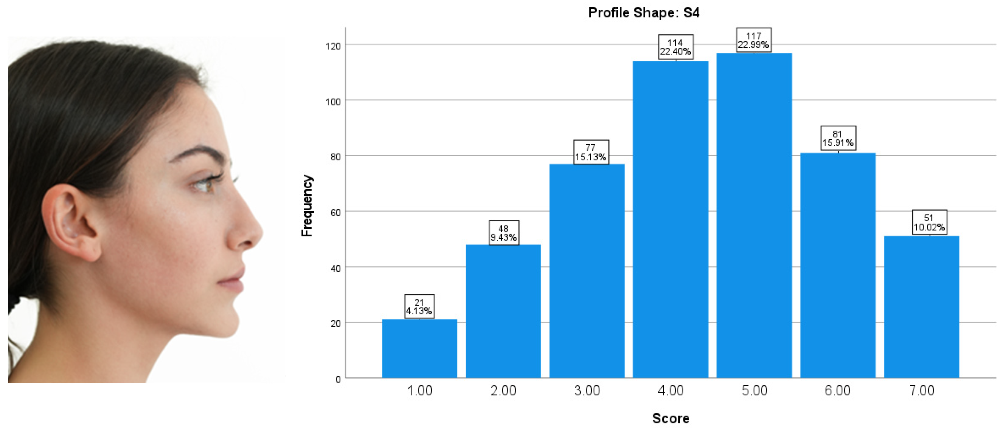 The participants’ ratings for Profile Shape S4 were predominantly clustered within the mid-range attractiveness scores. A score of 5 was the most frequently assigned value (22.99%), followed closely by 4 (22.40%). Overall, moderate attractiveness scores (3–5) accounted for 60.52% of all responses. Lower attractiveness scores (1–2) represented 13.56% of the evaluations, while higher scores (6–7) accounted for 25.93%. Overall, Profile Shape S4 was perceived as moderately attractive, reflecting a balanced and neutral esthetic evaluation without strong positive or negative judgments (