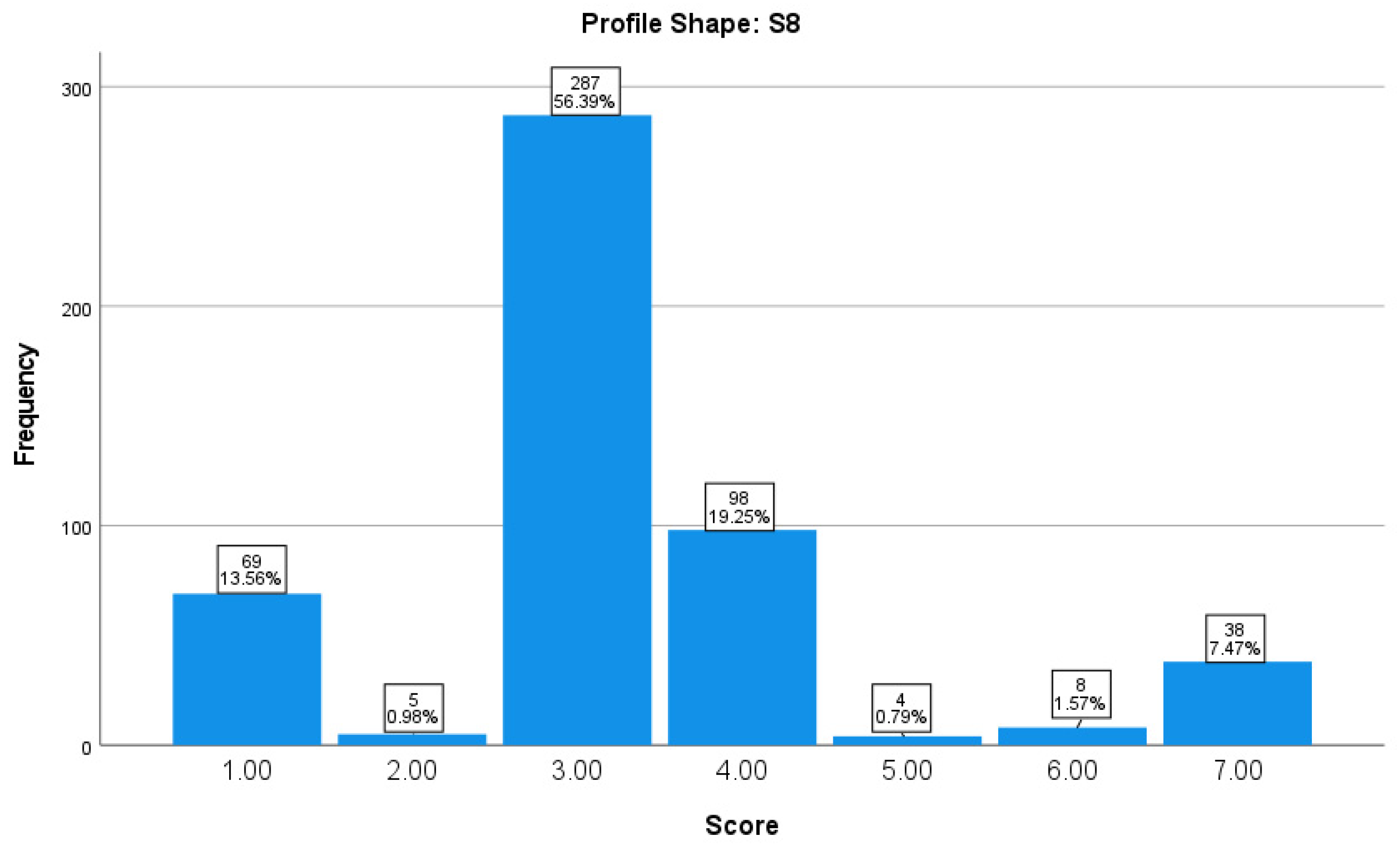 The participants’ ratings for Profile Shape S7 were mainly concentrated within the low attractiveness range. A score of 2 was the most frequently assigned value (25.34%), followed by 1 (22.20%) and 3 (22.40%). Together, these scores accounted for 69.94% of all responses. Moderate attractiveness scores (4–5) represented 24.16% of the evaluations, while high attractiveness scores (6–7) were rarely assigned, accounting for only 5.90% of responses. Overall, Profile Shape S7 was perceived as unattractive, indicating a general tendency toward a negative aesthetic evaluation among participants (