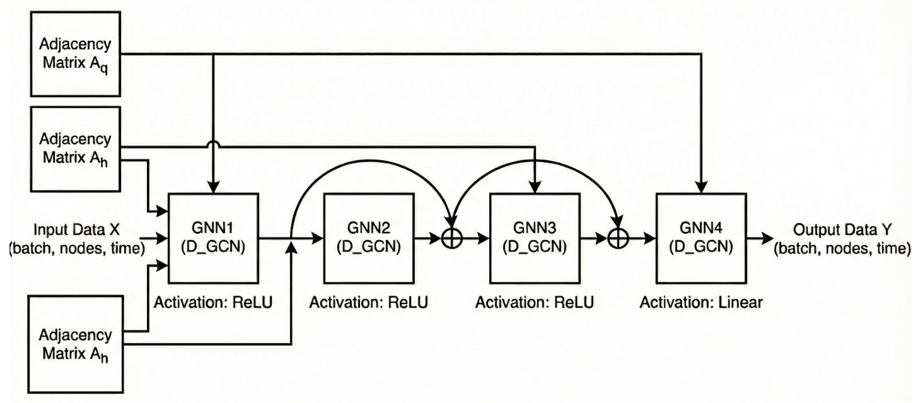 Figure 1. The interpolation performance of the DG model is compared with that of the KCN model and the OK method. To eliminate the randomness of single experiments, an ensemble test involving 100 random selections of hidden stations was conducted, with the shaded areas in the figures representing the standard deviation range of the multiple experiments. Specifically, data from the first 90% of the time points serve as the training set X to test the performance of the KCN and OK methods on the remaining 10% of time points. The DG model, with an input sequence length of h = 6 (i.e., the previous six days, t-6~t-1), simultaneously outputs the interpolated values for the current day (t0). The newly predicted data are then iteratively fed back as inputs for subsequent forecasts. By leveraging graph neural networks to deeply integrate the temporal dynamics and spatial distribution characteristics of meteorological variables, the model achieves accurate reconstruction and correction of data in unobserved regions.