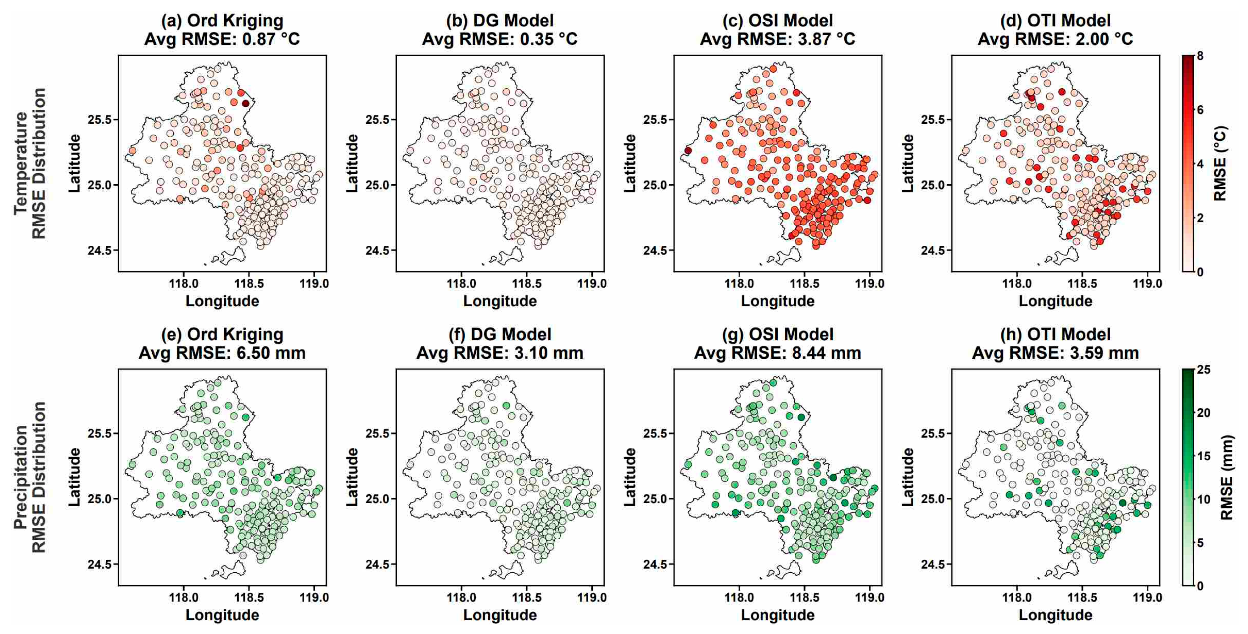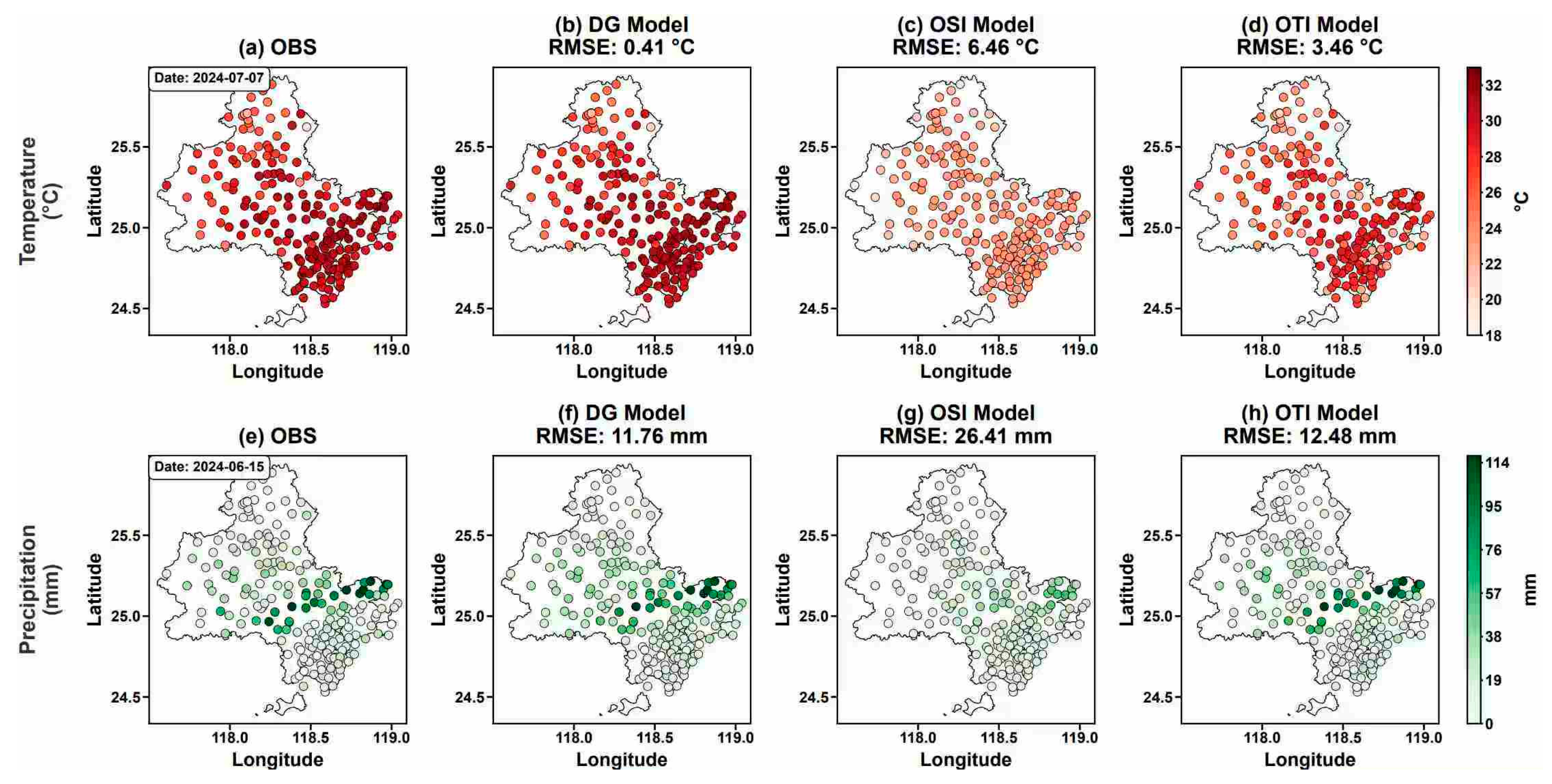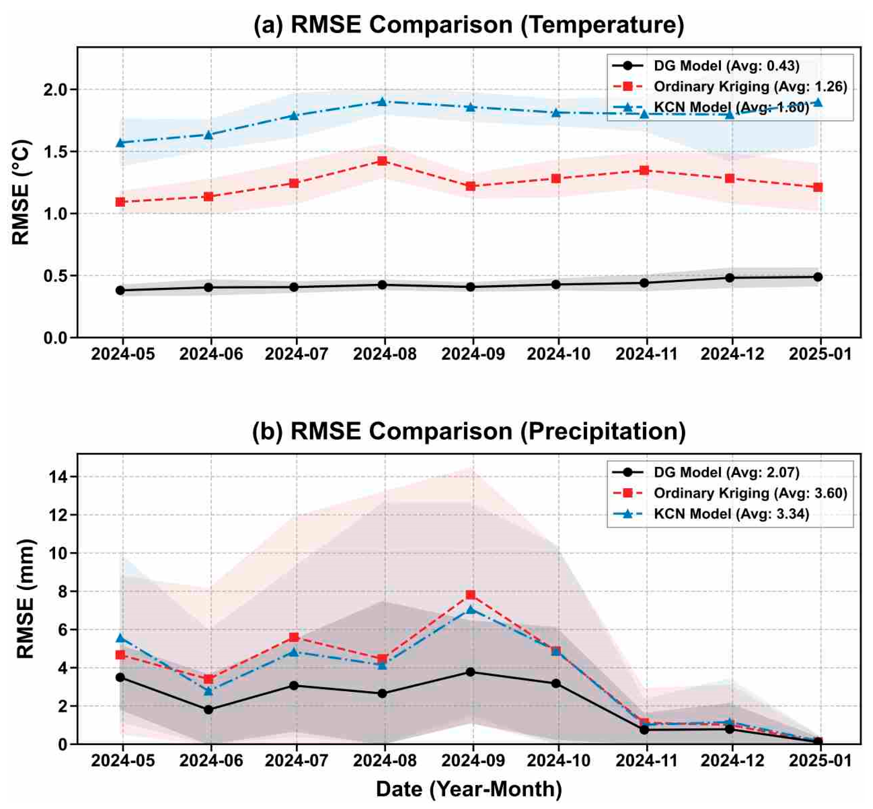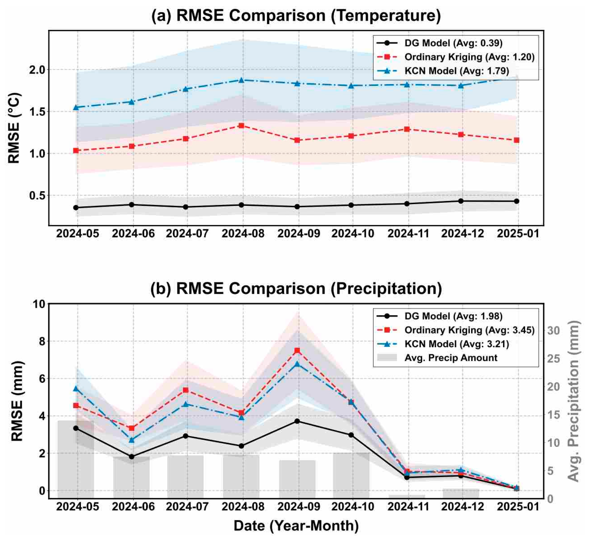Figure 3 presents the time stability of temperature and precipitation forecasts. During May 2024 to January 2025, DG consistently achieves significantly lower root mean square error (RMSE) in temperature predictions than both the OK and KCN models. Its average RMSE is 0.40 °C, far superior to 1.21 °C for OK and 1.84 °C for KCN (