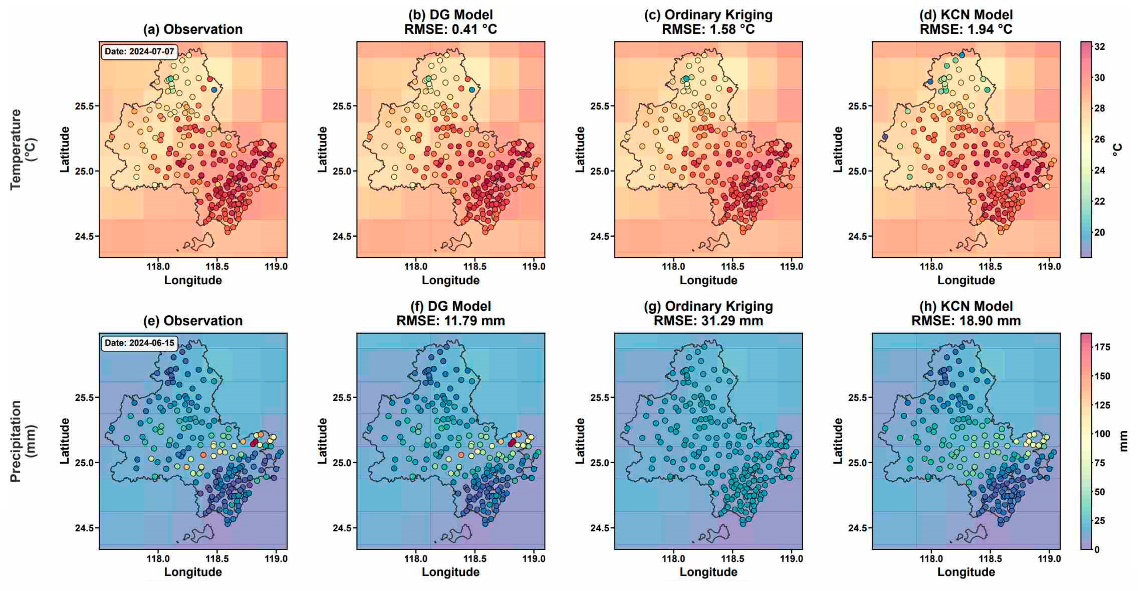 For the precipitation case on 15 June 2024, DG achieves an RMSE of 11.79 mm/day, whereas OK yields an RMSE of 31.29 mm/day and the KCN model yields an RMSE of 18.90 mm/day. Observations indicate a pronounced heavy rainfall zone along the southeastern coast of Quanzhou, exhibiting significant spatial heterogeneity. However, the OK analysis (
