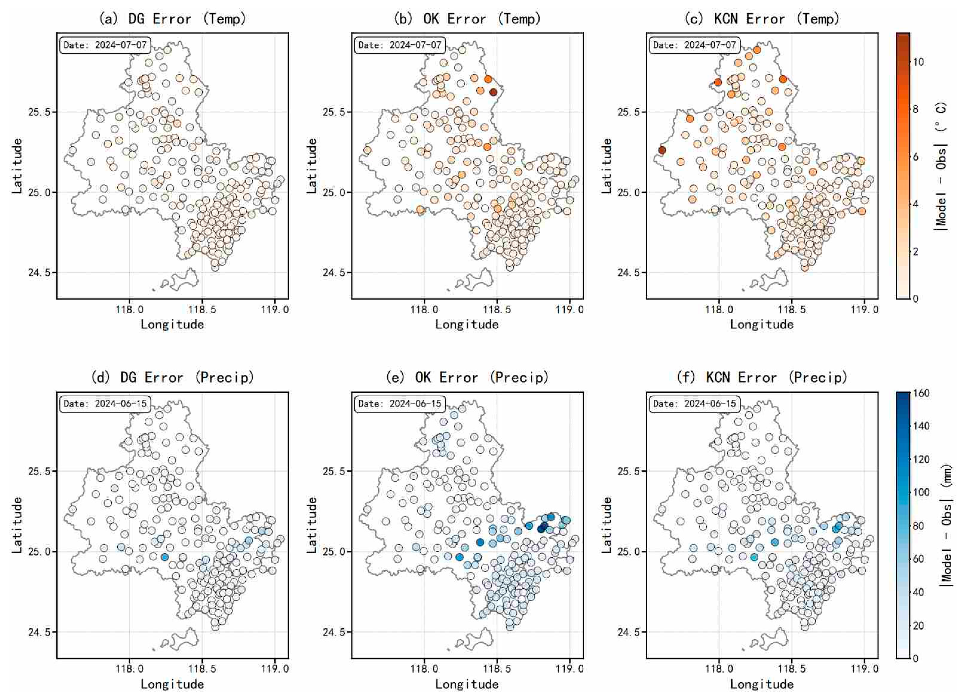 Figure 6) further highlight the DG model’s advantage in capturing this extreme precipitation, while both the OK method and the KCN model exhibit varying degrees of pronounced error clustering in the southeastern part of Quanzhou, particularly in the heavy rainfall region. Together, the interpolation results from these two cases demonstrate that DG, by leveraging its inherent strengths and incorporating prior station observations, achieves substantially better predictive performance than the OK method and conventional deep learning models for both temperature fields and precipitation fields with localized heavy rainfall.