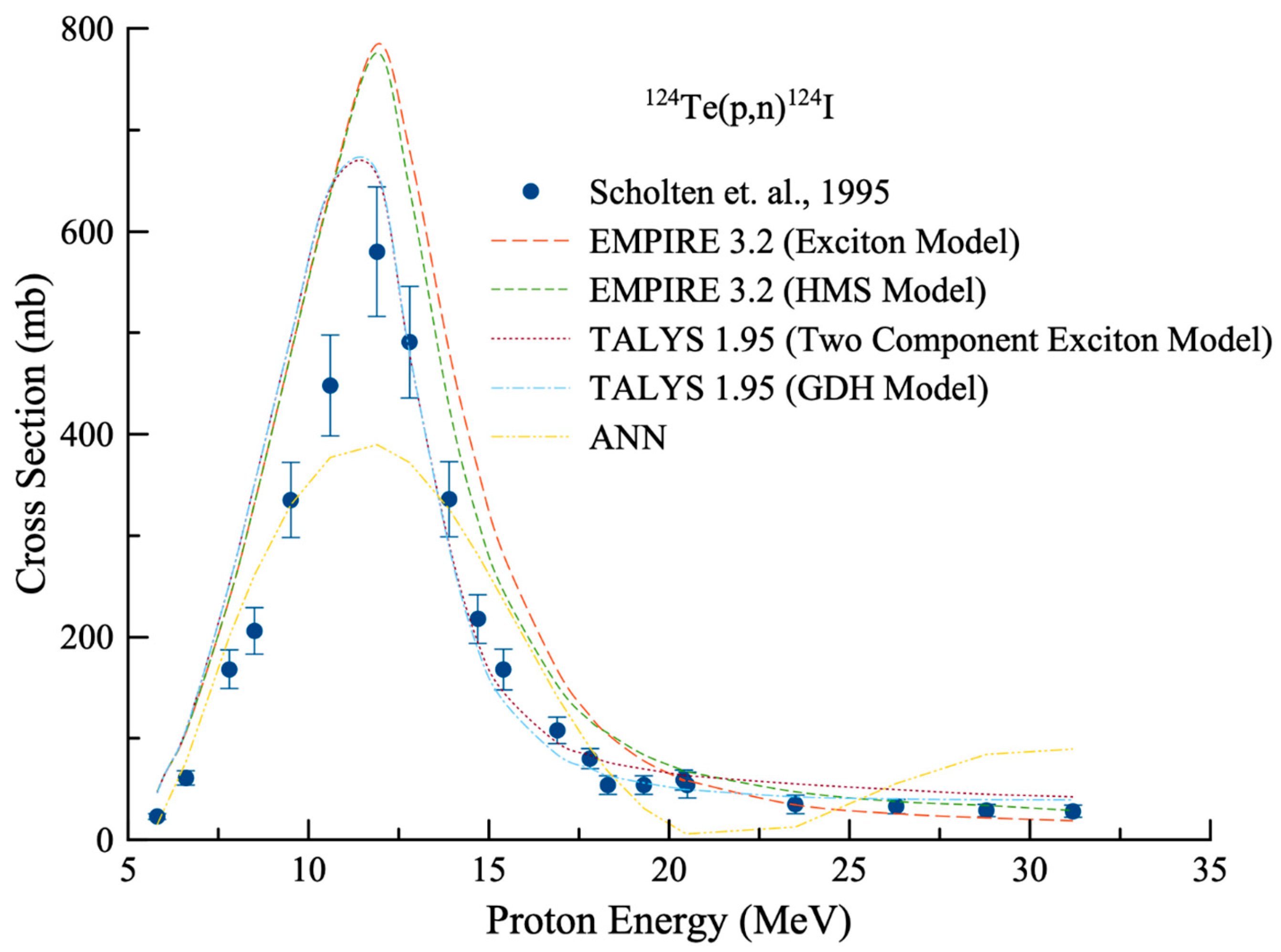A comparable trend was observed for the 126Te(p,3n)124I reaction. Although TALYS and EMPIRE calculations captured the location of the excitation function maximum in the 25–30 MeV energy range, the ANN model again yielded the lowest error metrics, indicating a closer match to the experimental data. Among the theoretical approaches, EMPIRE with the HMS model provided slightly improved agreement relative to TALYS. Nevertheless, the ANN approach consistently offered the best overall predictive performance, underscoring its capability to learn complex nonlinear relationships directly from experimental datasets.