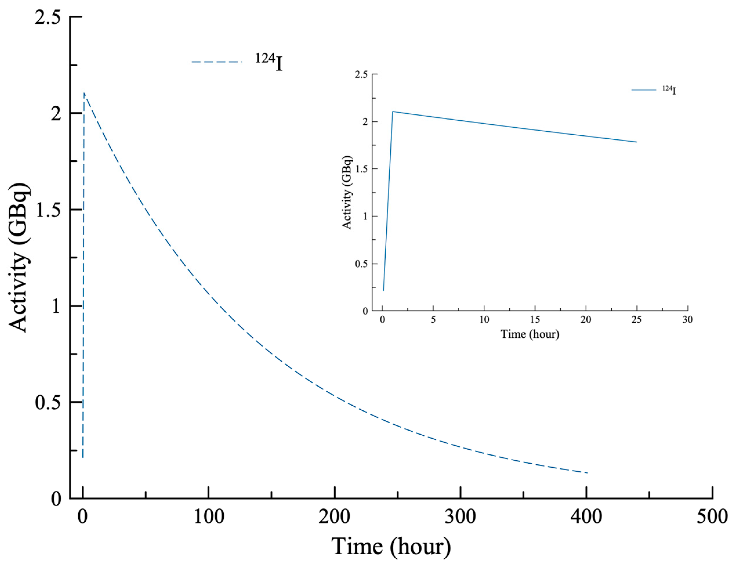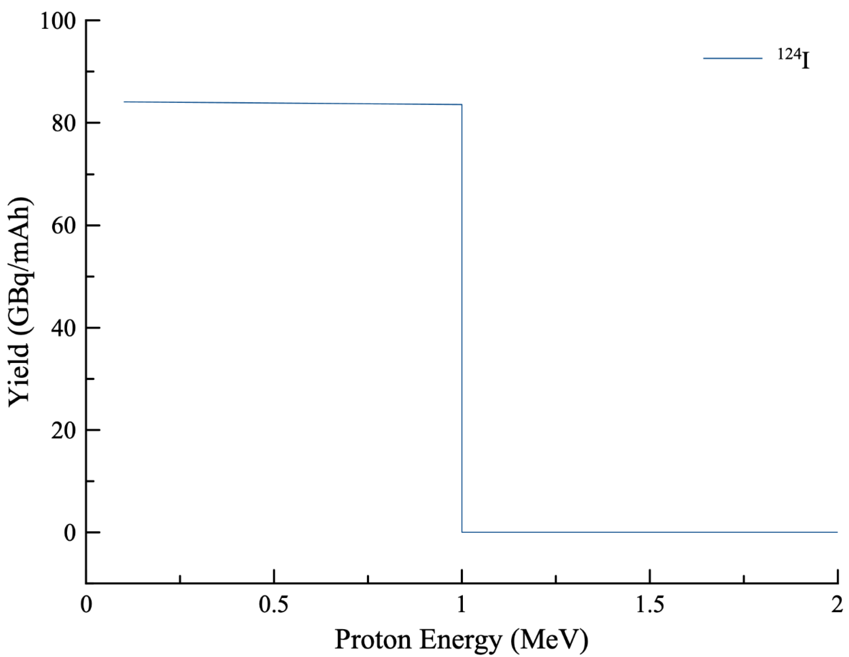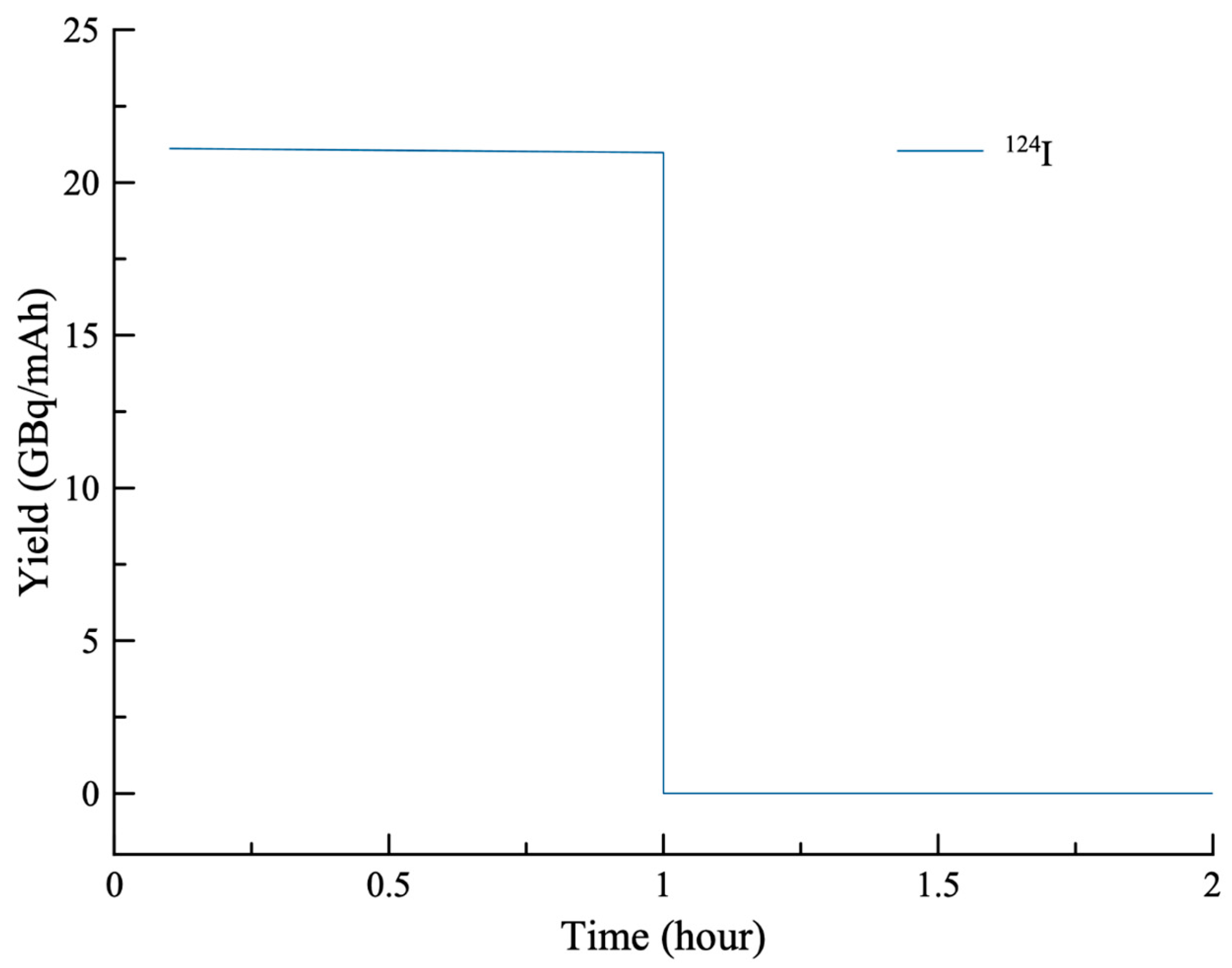 124Te(p,n) reaction, the calculated activity of approximately 2.1 GBq following a 1 h irradiation at 11.9 MeV and 0.1 mA beam current corresponds to a production yield of about 21 GBq/mAh. In contrast, the