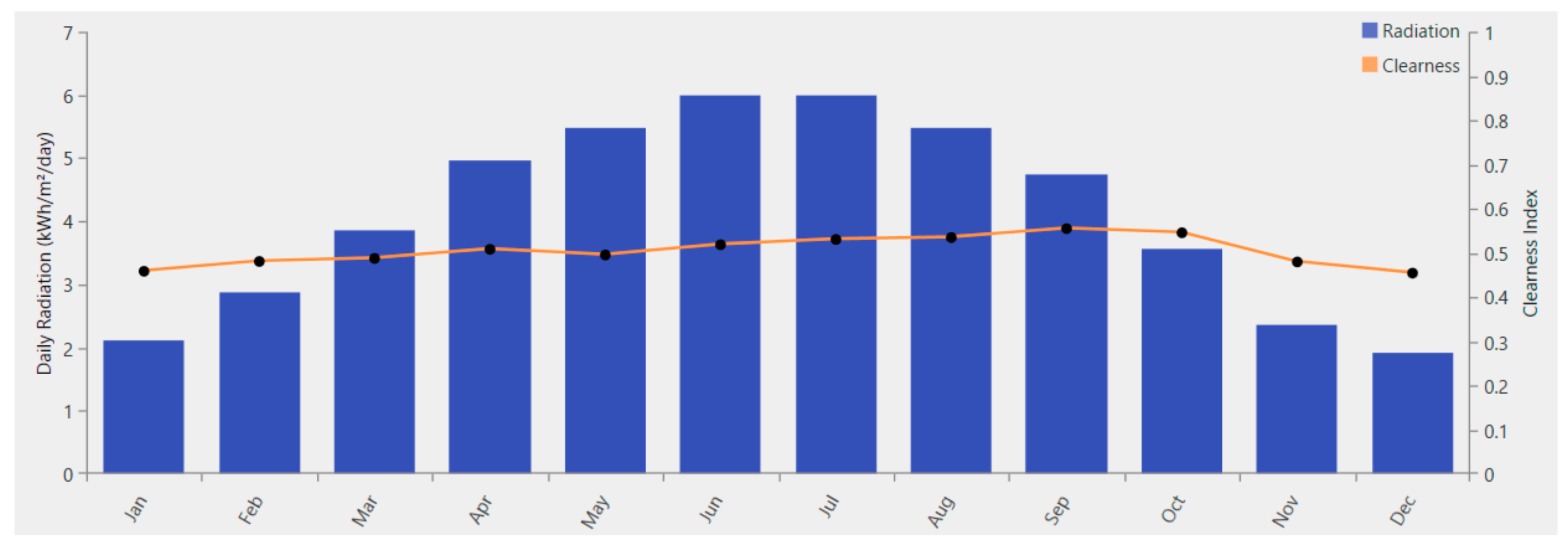 2/day during June and July, before declining toward colder months. The clearness index follows a similar pattern, indicating improved solar availability and reduced atmospheric attenuation during summer.