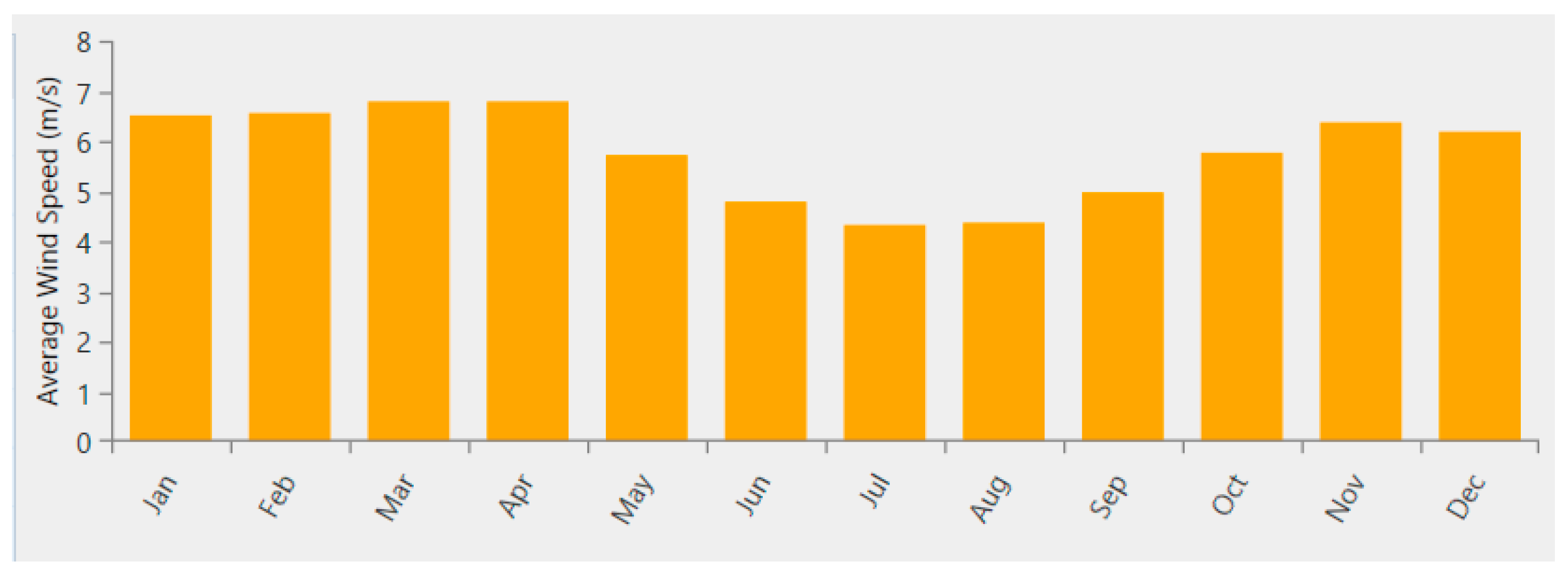 Figure 3 indicates that average wind speeds remain relatively stable throughout the year, ranging approximately between 4 and 7 m/s, with higher values observed during late winter and early spring months and slightly reduced wind availability during midsummer. This seasonal complementarity between solar and wind resources supports the feasibility of hybrid PV–wind configurations for mitigating renewable intermittency in standalone operation.