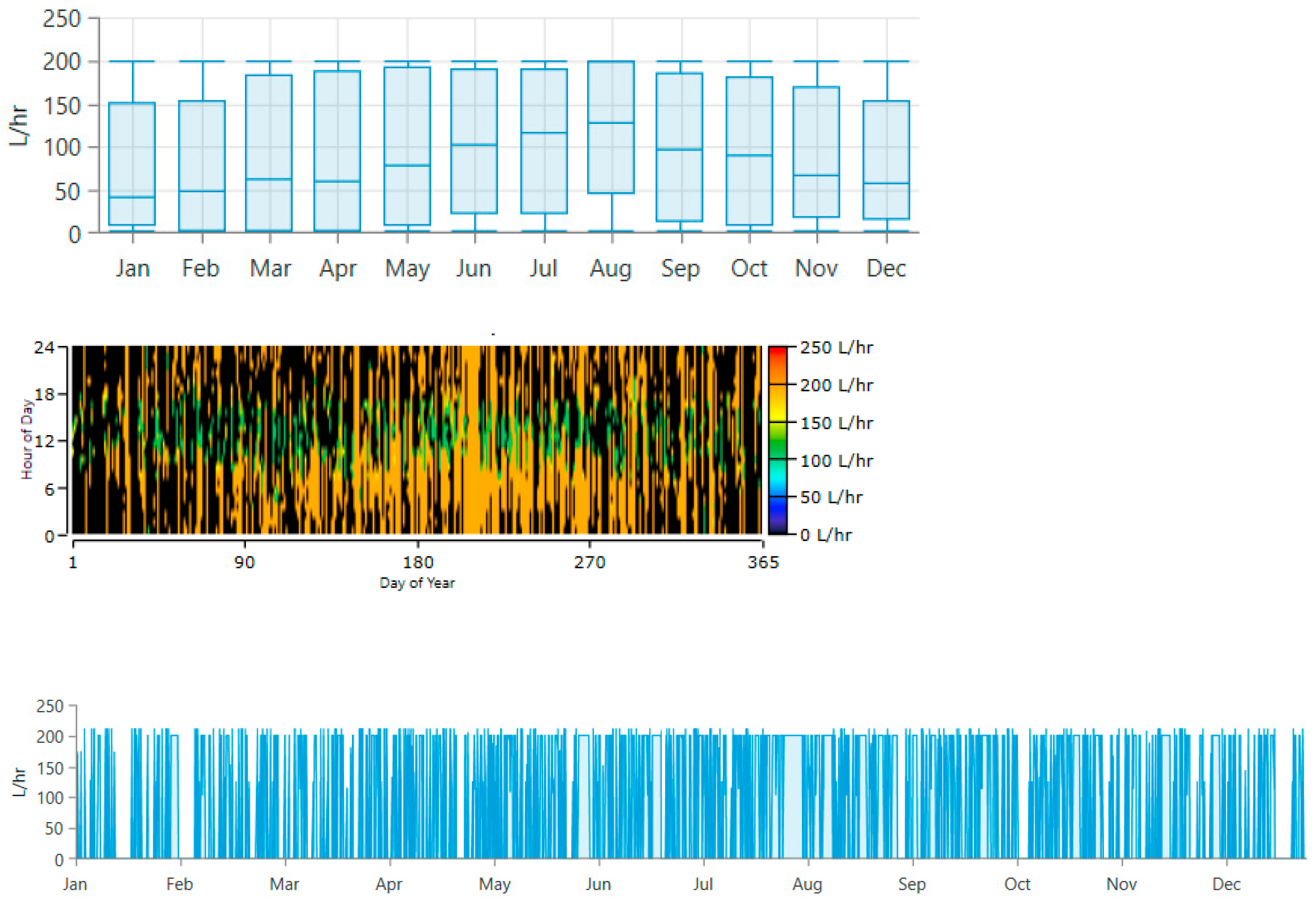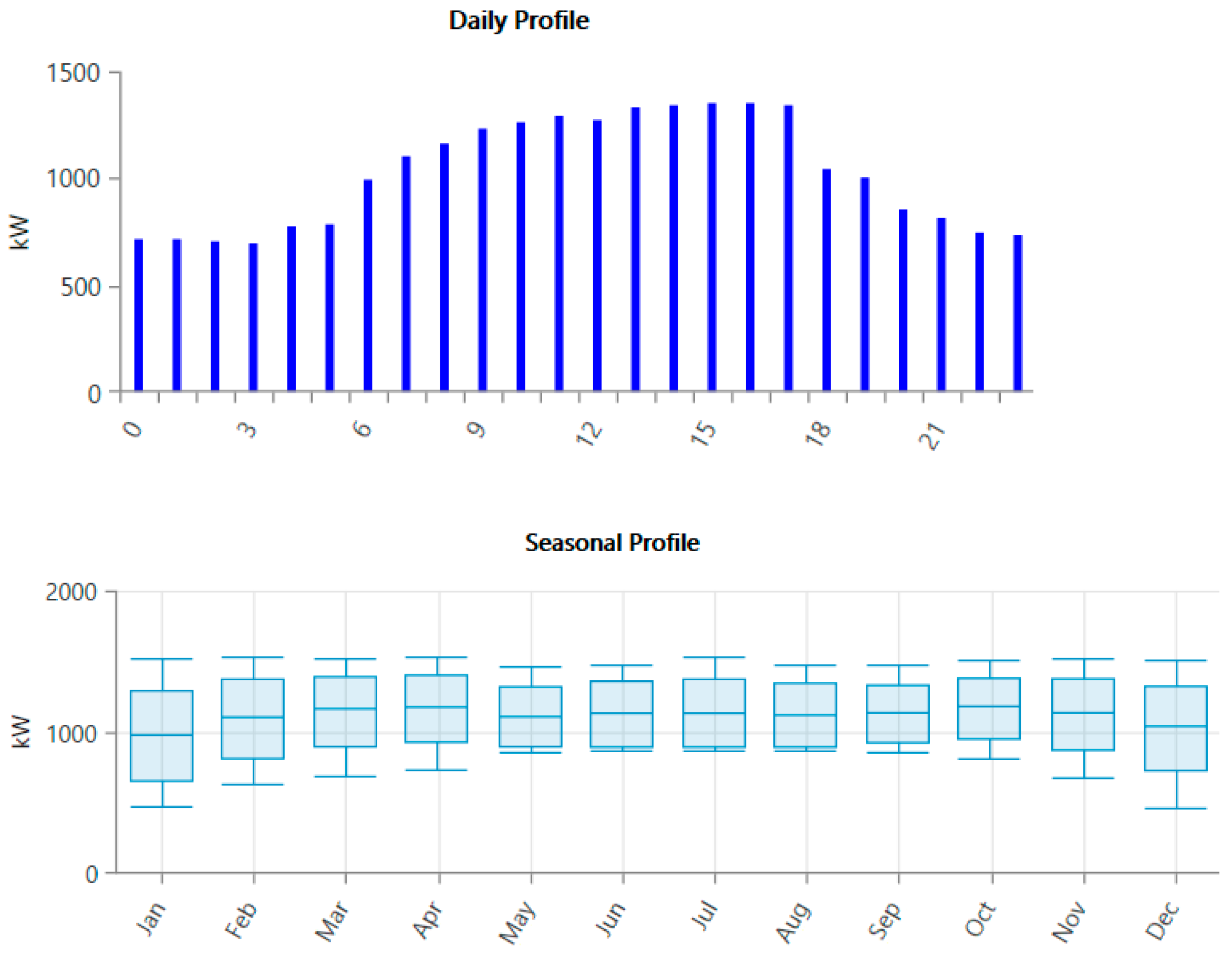 Figure 4 illustrates that the hospital load exhibits pronounced diurnal and seasonal variations. The daily load profile shows peak demand occurring during daytime and early evening hours, with maximum values exceeding 1.25 MW, reflecting intensive clinical, HVAC, and auxiliary equipment usage. The seasonal load profile in this figure indicates that the hospital’s median electrical demand remains relatively uniform throughout the year, reflecting the continuous and non-deferrable nature of critical facility operations. However, increased variability is observed during the winter months starting from November, as evidenced by wider interquartile ranges and extended upper whiskers. This suggests more frequent high-demand episodes during colder periods, likely driven by heating, ventilation, lighting, and weather-related operational requirements. In contrast, summer demand exhibits comparatively tighter distributions despite elevated solar irradiance availability. These characteristics impose stringent reliability requirements on the standalone microgrid across all seasons, particularly during winter periods when higher load variability coincides with reduced solar generation, reinforcing the need for sufficient storage capacity and dispatchable generation.