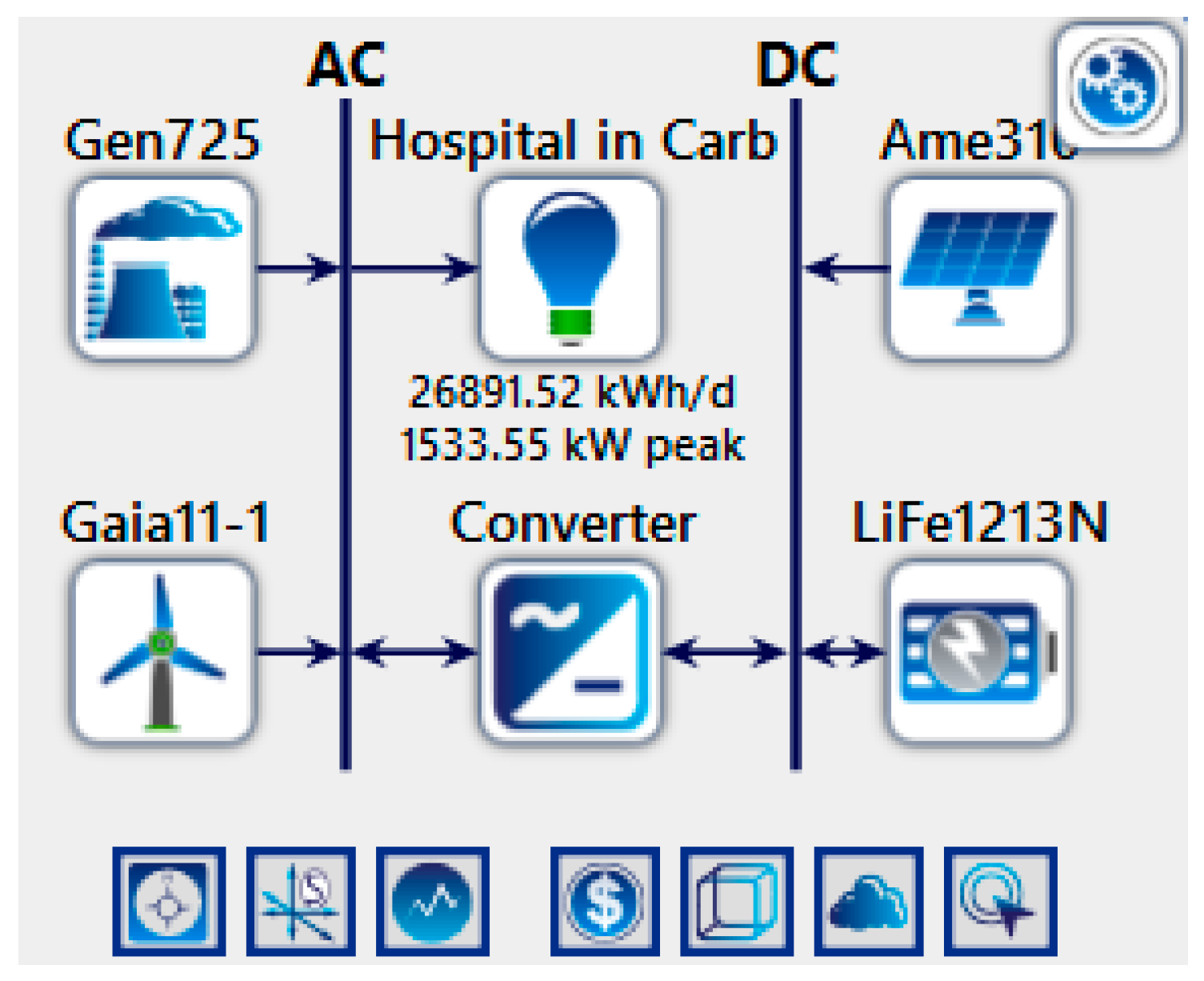 A bidirectional power converter was included to facilitate power exchange between DC and AC subsystems. A generic converter with a design lifetime of 15 years and an efficiency of 95%, as provided in the HOMER software library, was adopted to represent commercially available power electronic interfaces. In the proposed configuration, PV generation and battery storage are connected to the DC bus, while the wind turbine, diesel generator, and electrical load are connected to the AC bus. This architecture enables efficient DC-coupled renewable integration while maintaining compatibility with AC-based generation and demand. From a microgrid integration standpoint, the converter is essential for coordinated operation of heterogeneous resources, supporting stable power flow, reducing conversion losses, and addressing the challenge of integrating diverse generation technologies within a unified standalone microgrid framework.