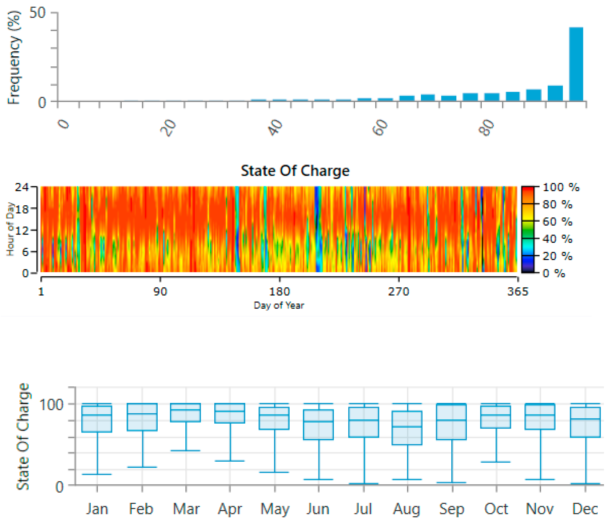 Figure 9 illustrates the operational behavior of the battery energy storage system in the optimal hybrid microgrid configuration under the 85% PV derating scenario. The first subplot depicts the frequency distribution of the battery state of charge (SOC) over the annual horizon, indicating how often the storage system operates at different charge levels throughout the year. The second subplot presents the hourly SOC evolution across all days of the year, and the third subplot shows the monthly distribution of SOC highlighting seasonal variations in storage utilization.