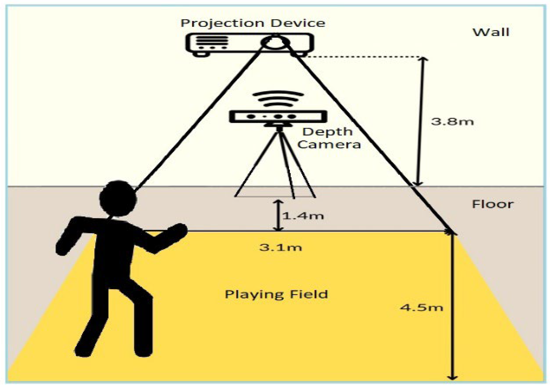 The projection-based RAT system consisted of four main components: (i) a control unit, (ii) a wide-angle projector, (iii) a three-dimensional depth camera, and (iv) a designated projection area on the floor (