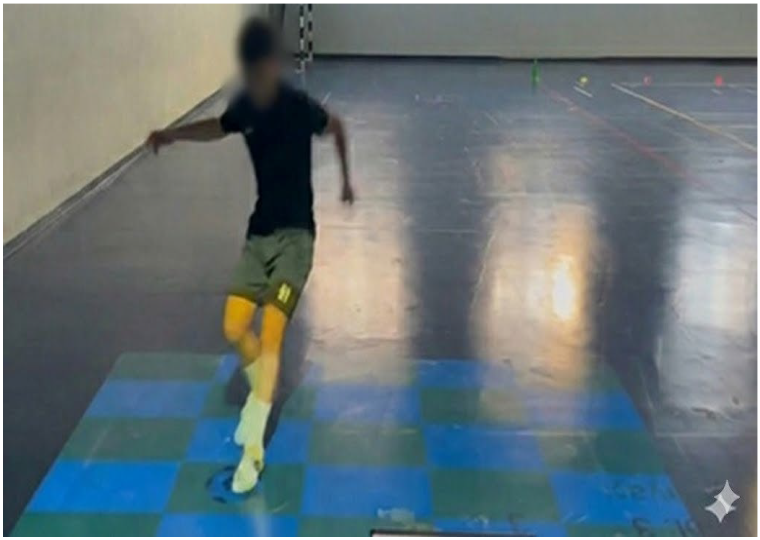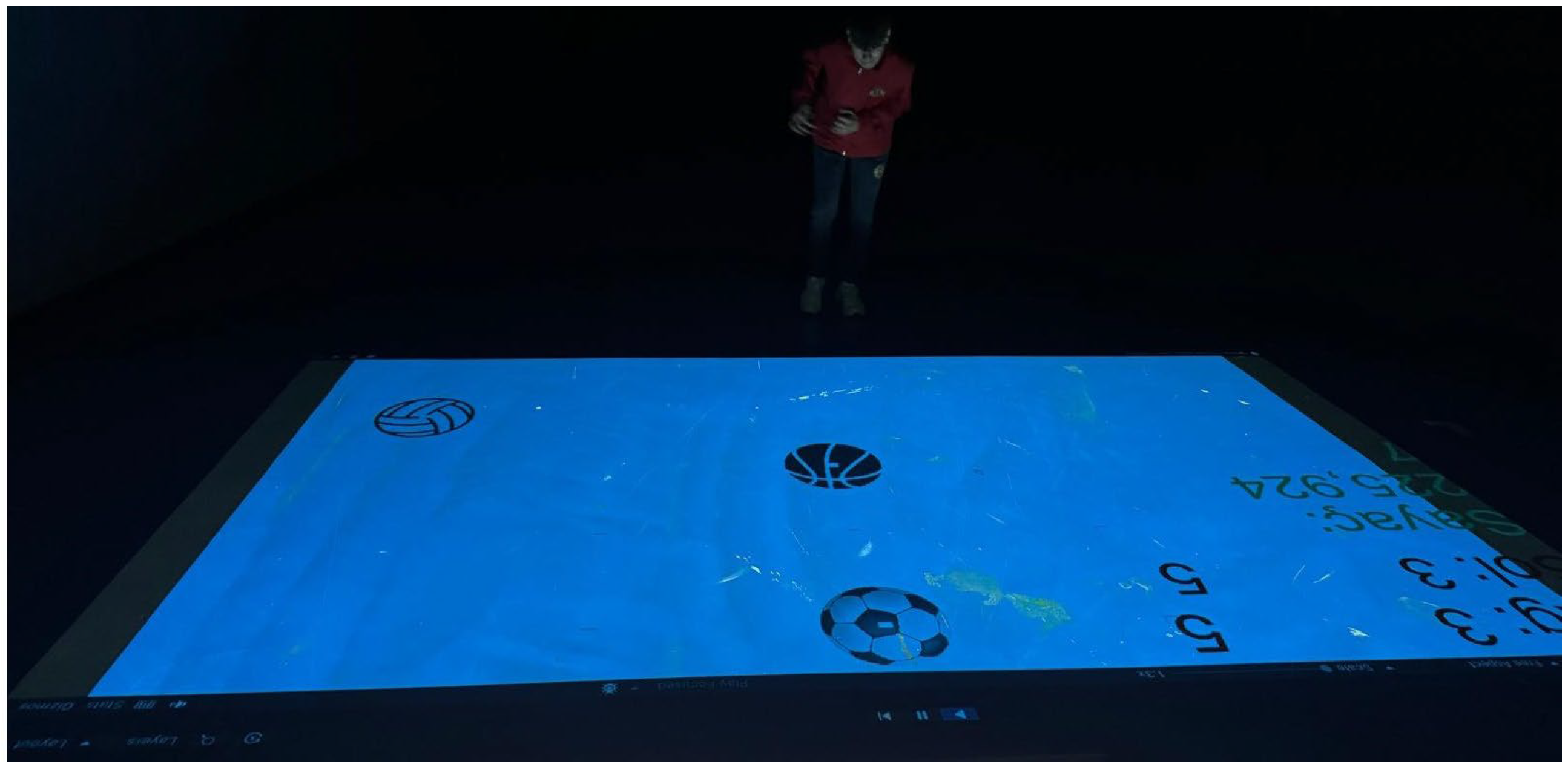 Figure 4), three different ball images (soccer, volleyball, and basketball) were simultaneously projected onto three separate locations on the floor. The athlete was instructed to respond exclusively to the soccer ball stimulus by stepping on it with the foot. After deactivating the target stimulus, the athlete was required to return to the starting gate before a new set of stimuli (soccer, basketball, and volleyball balls) was projected at different locations within the testing area. If the athlete moved toward and stepped on a non-target stimulus, the system did not deactivate the stimulus and did not present a new stimulus set, thereby requiring the athlete to correct the response and reorient toward the target. In this protocol, five target soccer ball stimuli were randomly presented to each participant. To ensure consistency across participants, the distance between the starting position and each projected target stimulus was calculated, and the total distance covered during the test was standardized so that all athletes completed the same overall movement distance. Thus, although different spatial configurations were used for each participant, performance was assessed independently of distance. The test was completed when the athlete deactivated the fifth target stimulus and returned to the starting position. The total completion time determined by the system was recorded as the test outcome.