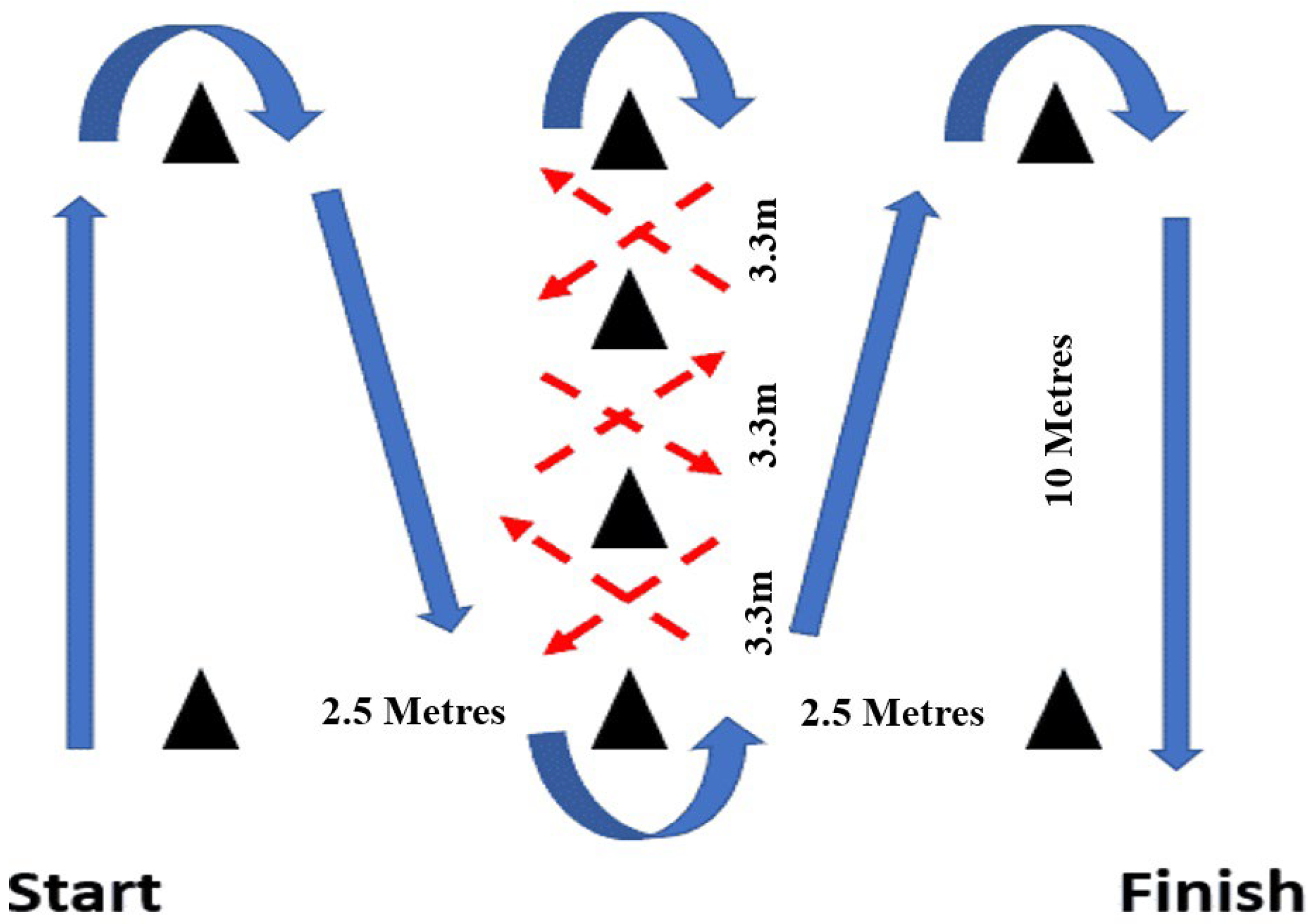 The Illinois Agility Test course consists of a rectangular area measuring 10 m in length and 5 m in width, with three cones aligned in a straight line at 3.3 m intervals in the central section of the course (