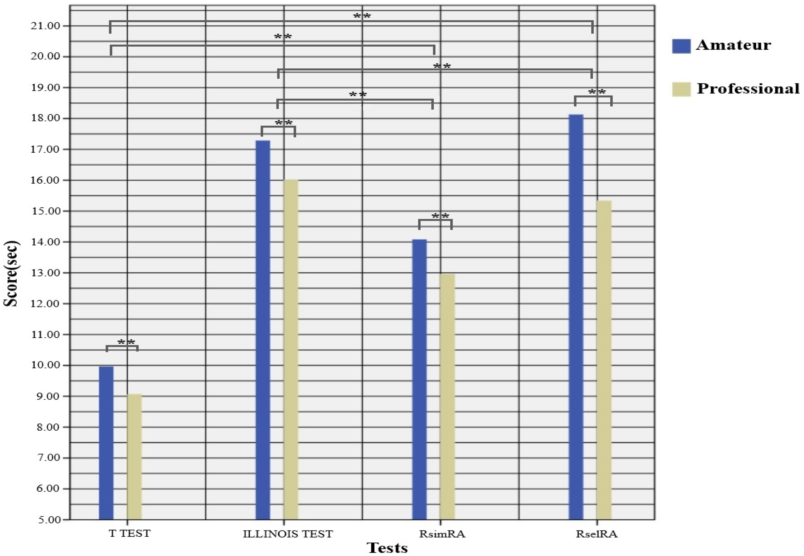 To evaluate the field validity of the proposed system, planned change-of-direction (PCOD) performance and reactive agility (RA) performance of amateur and professional players were compared, and the relationship between the two testing protocols was examined. It was hypothesized that PCOD performance would differ significantly between amateur and professional players, while RA performance would demonstrate a greater performance advantage for professional players compared with PCOD tests. In addition, a significant relationship between PCOD tests and RA tests obtained from the newly developed system was expected. Confirmation of these hypotheses would indicate that the system is capable of discriminating between competitive levels.