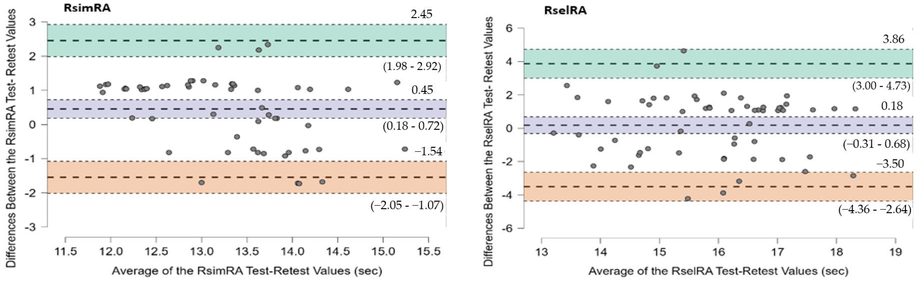 The test–retest reliability results demonstrate that the developed system provides stable and repeatable measurements, with excellent intraclass correlation coefficients and low measurement error. Although small systematic improvements were observed between test sessions, these changes are likely attributable to familiarization or learning effects rather than measurement instability [