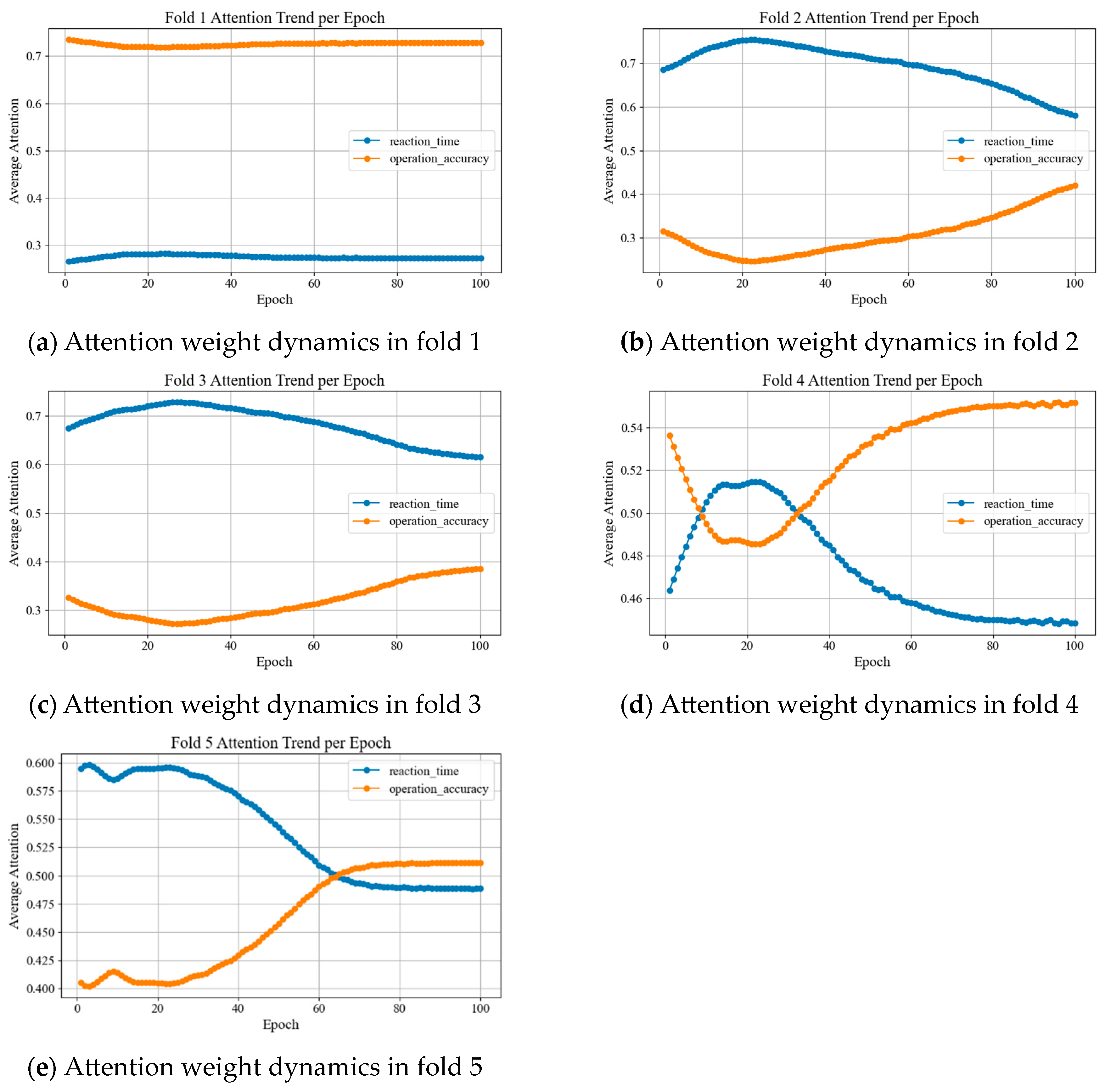 Figure 4 illustrates the evolution of attention weights during the training process for a representative cross-validation fold. As shown in the figure, the model initially assigns different attention weights to reaction time and operation accuracy, which gradually stabilize as training progresses. In this fold, the orange curve representing the attention weight for operation accuracy decreases slightly before converging to a dominant level, whereas the blue curve for reaction time increases modestly and subsequently stabilizes. This dynamic adjustment indicates that the model progressively allocates attention to the features that are most informative for classification. Because operation accuracy contributes more strongly to distinguishing takeover performance levels in this fold, the model ultimately assigns greater attention weight to this feature. Meanwhile, the attention weight assigned to reaction time, although slightly lower, remains substantial, reflecting its continued relevance under this condition. Overall, training processes across different folds exhibit a consistent pattern of dynamic adjustment followed by convergence of attention weights, suggesting that the model adapts its feature emphasis to data characteristics and ultimately settles into a stable distribution. This converged attention distribution not only contributes to improved classification performance but also enhances model interpretability, as inspection of attention weights allows intuitive identification of the features considered most critical in evaluating train operator takeover performance.