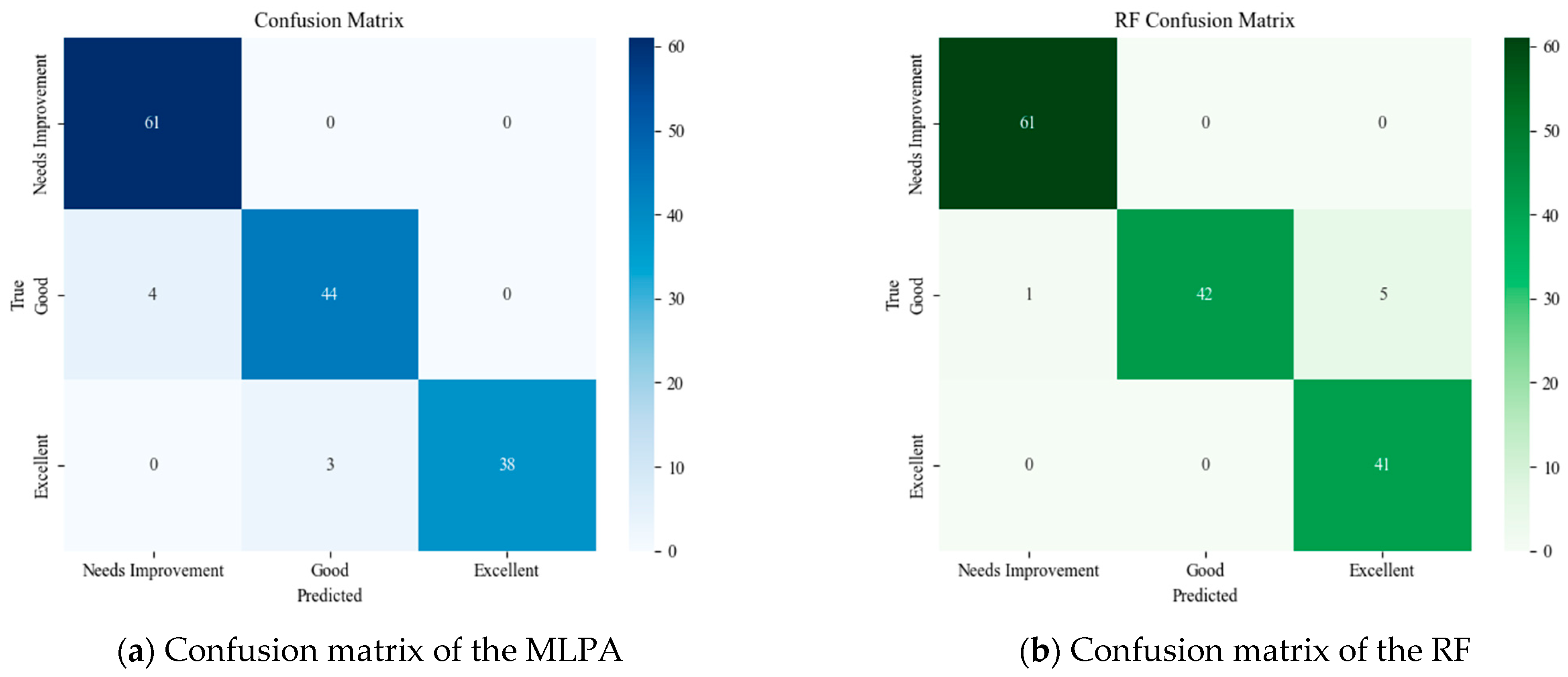 Figure 6, most samples are concentrated along the diagonal, indicating a high proportion of correct predictions. Notably, the “Excellent” category achieved a recall rate of 100%, indicating that all truly excellent takeover instances were correctly identified and that high-performance behaviors were rarely missed. Misclassifications primarily occurred between adjacent categories: a small number of samples labeled as “Good” were misclassified as “Excellent,” and some “Needs Improvement” samples were classified as “Good.” This pattern suggests that the model may slightly overestimate performance near decision boundaries, while rarely confusing poor performance with the highest performance level. From a safety-management viewpoint, boundary confusions are less critical than extreme confusions (e.g., “Needs Improvement” classified as “Excellent”), and the absence of such extreme errors supports the suitability of the model for operational screening purposes. As a result, misclassifications concentrated in the “Good” category led to slightly lower precision and recall for this class compared with the others. In contrast, the RF model exhibited more precise classification for the “Needs Improvement” category, with no misclassifications, and performed slightly better than the MLPA model in identifying “Good” cases. Both models achieved perfect prediction for the “Excellent” category. Overall, both models were able to correctly assess takeover performance in most cases, with only minor deviations occurring near category boundaries.