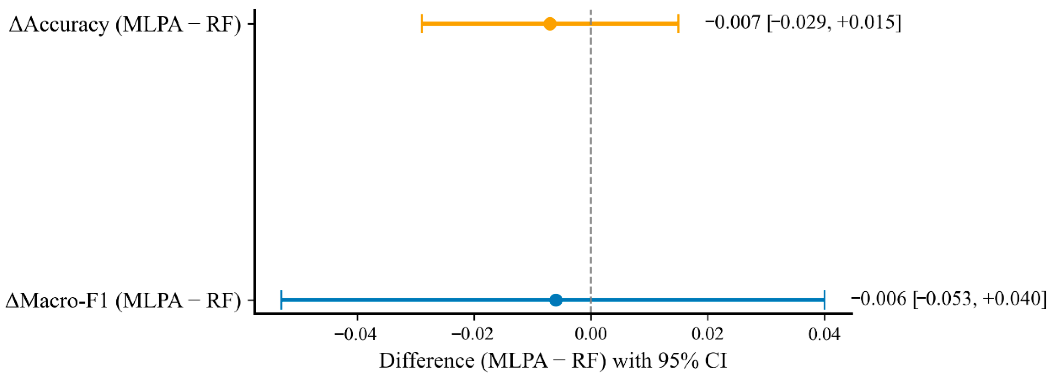 Figure 7 visualizes the differences in accuracy and macro-F1 (MLPA–RF) together with 95% bootstrap confidence intervals; in both cases, the intervals straddle zero, indicating no statistically reliable advantage for either model. Consistently, McNemar’s exact test yielded k = 6 and