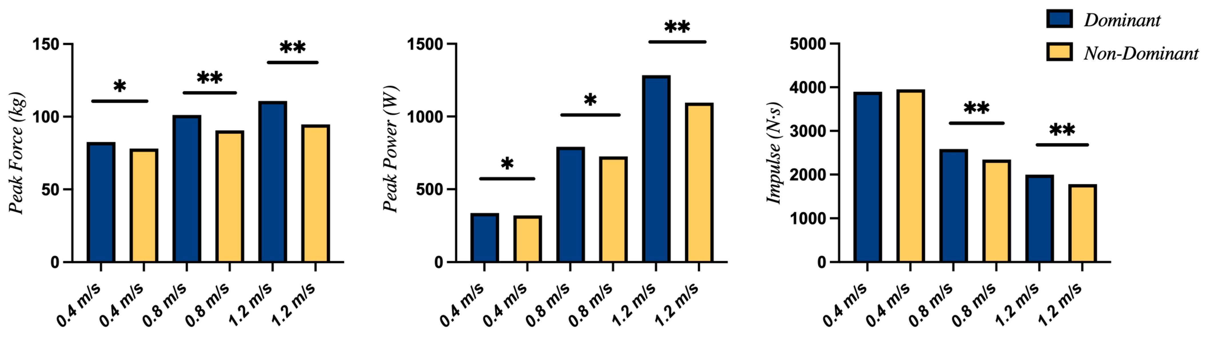 | Impulse (N·s)—0.8 m/s | 2587.04 ± 949.54 | 2344.12 ± 758.73 | <0.001 ** | 0.73 (Moderate) |