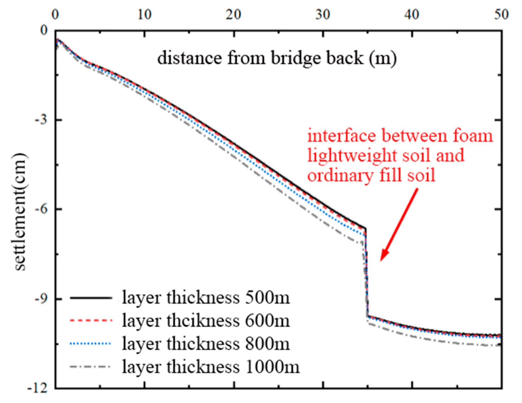 - The layered filling thickness of foamed lightweight soil has little effect on the settlement of the bridgehead section during the construction period and 15 years after construction. The post-construction settlement of the layered filling thickness of 1000 mm is slightly larger than that of the layered filling thickness of 500 mm, 600 mm, and 800 mm. In terms of stability, the safety factor of the layered filling thickness of 500 mm is the largest, and the safety factor of the layered filling thickness of 1000 mm is the smallest. According to the comprehensive settlement and stability, the optimal layered filling thickness is 500–600 mm.
