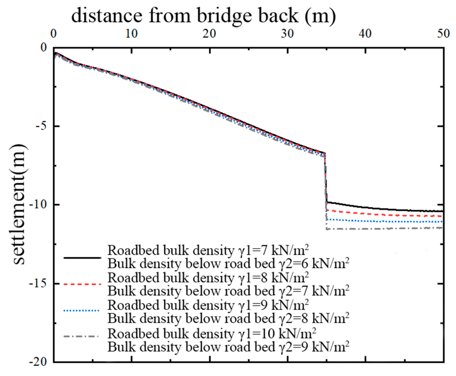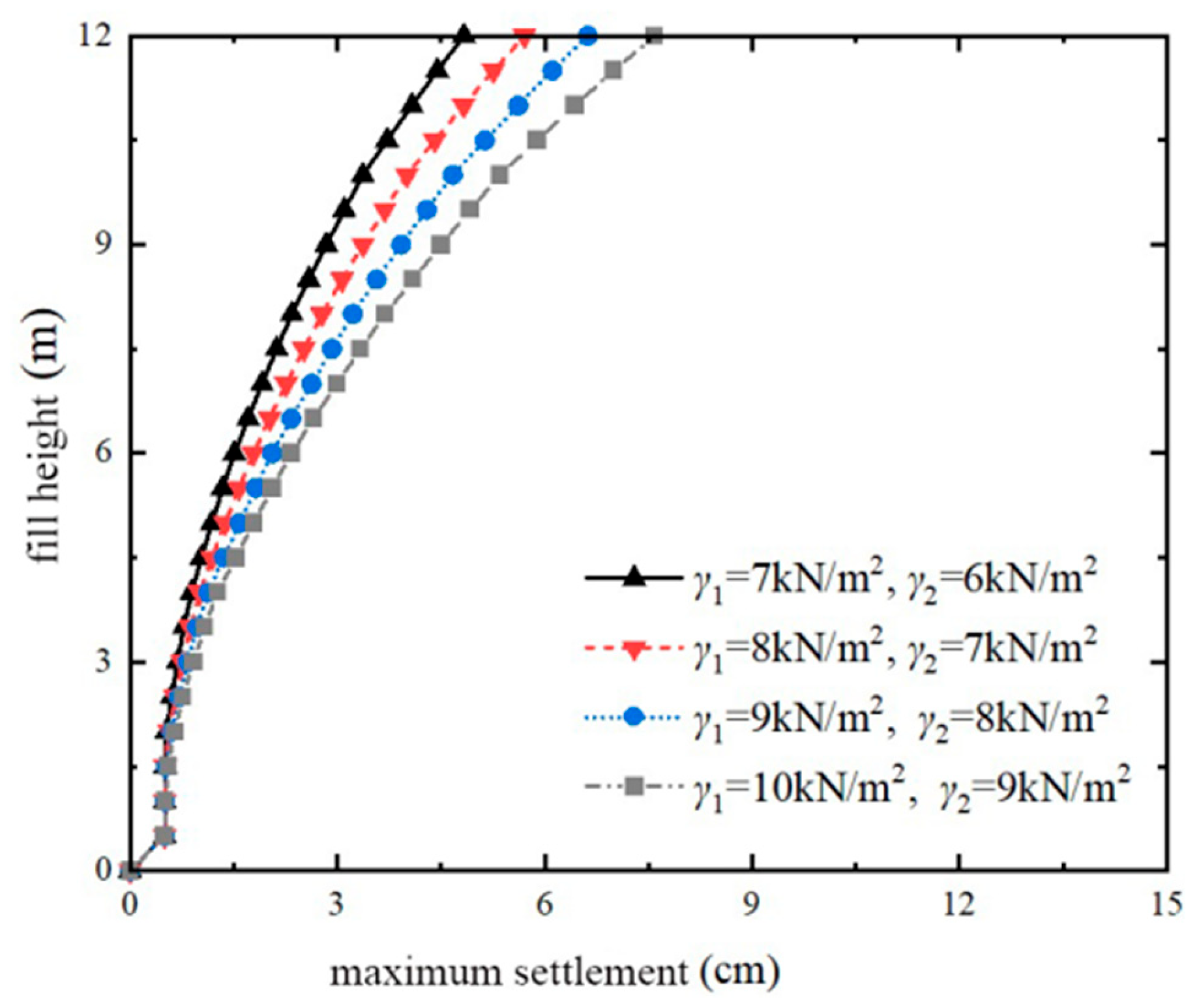 - The change of the maximum settlement of the embankment at the bridgehead section with the filling height during the construction period