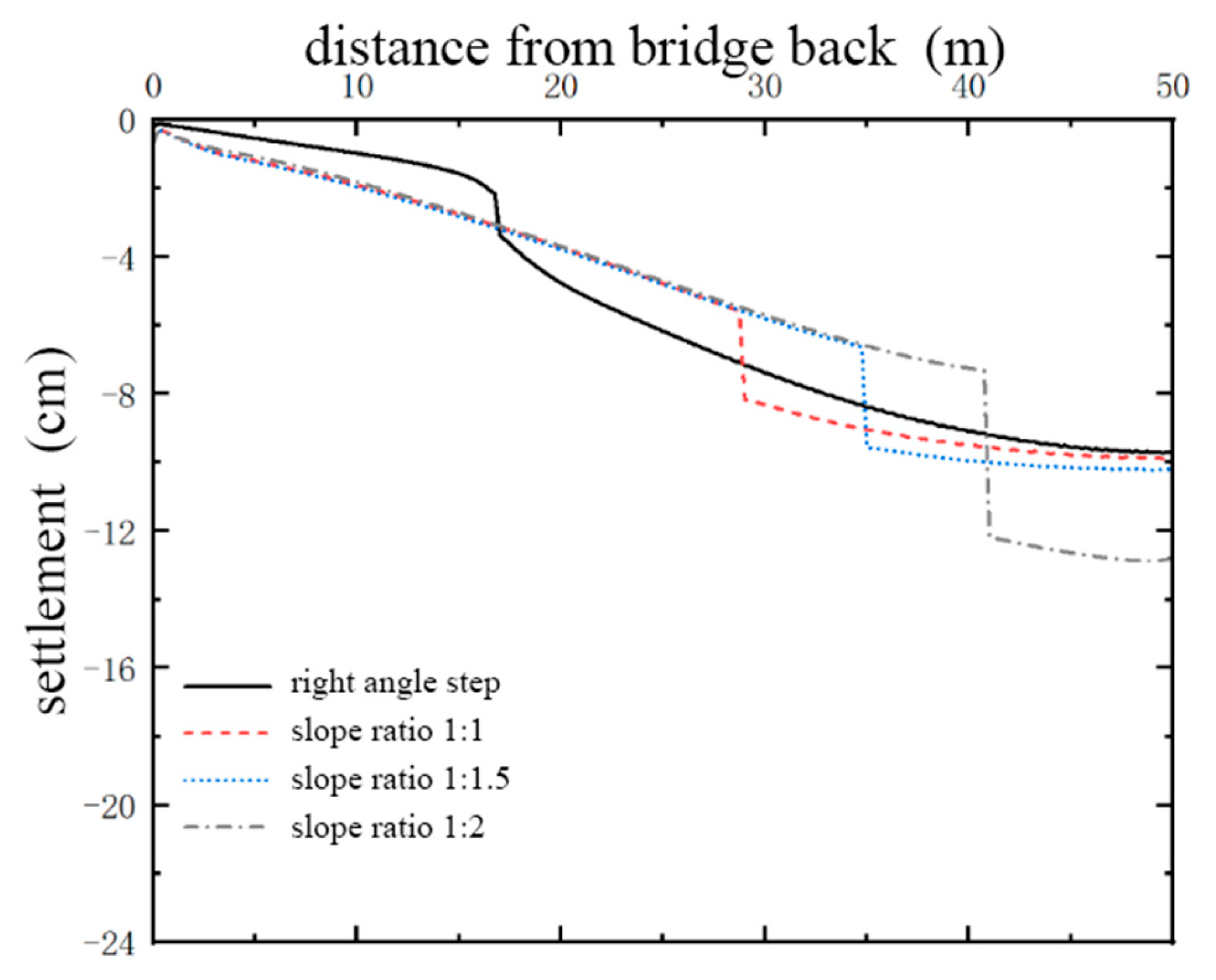 - The change of the slope ratio of the connecting surface will not affect the maximum settlement position of the whole bridge section; the decrease of the slope ratio of the buffer step will cause the increase of the post-construction settlement of the original embankment on the right side of the slope. The right-angle step as the connecting surface has a greater impact on the post-construction settlement of the slope than the buffer step. For the buffer step, the smaller the slope ratio, the greater the differential settlement, and the design differential settlement of the slope ratio of 1:2 is the largest, up to 40 mm. In terms of stability, the safety factor of the buffer step slope ratio of 1:1.5 is the largest, the safety factor of the slope ratio of 1:2 is the smallest, and the safety factor of the right angle step is smaller than that of the buffer step. Considering the settlement and stability, the buffer step is selected as the connecting surface, and the slope ratio is designed to be 1:1.5.