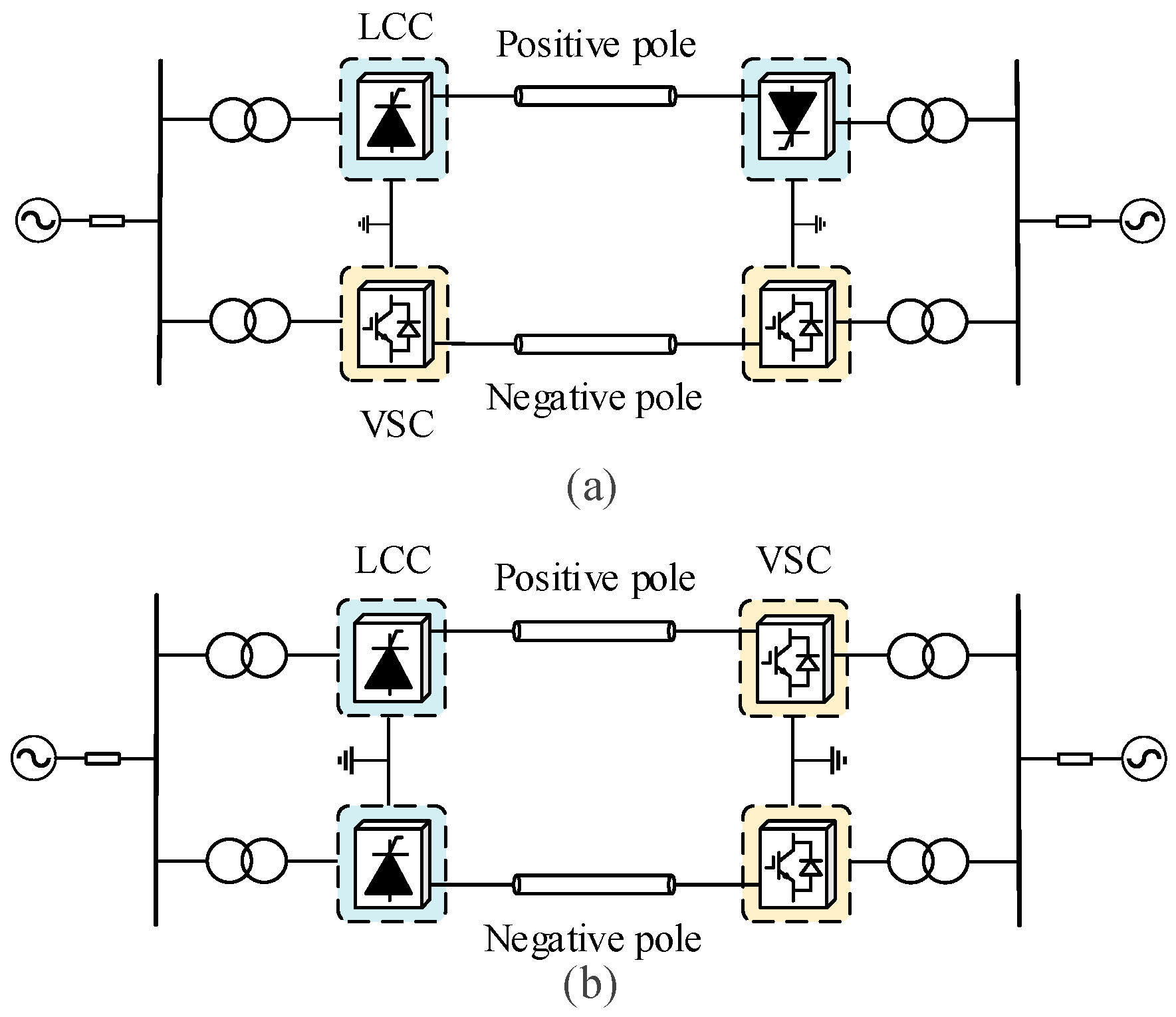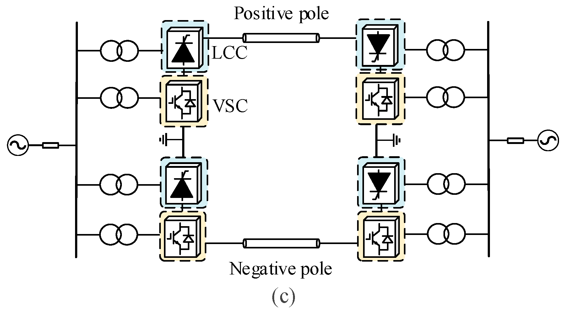 - Xiao, H.; Sun, K.; Pan, J.; Li, Y.; Liu, Y. Review of hybrid HVDC systems combining line communicated converter and voltage source converter. Int. J. Electr. Power Energy Syst. 2021, 129, 106713. [Google Scholar] [CrossRef]