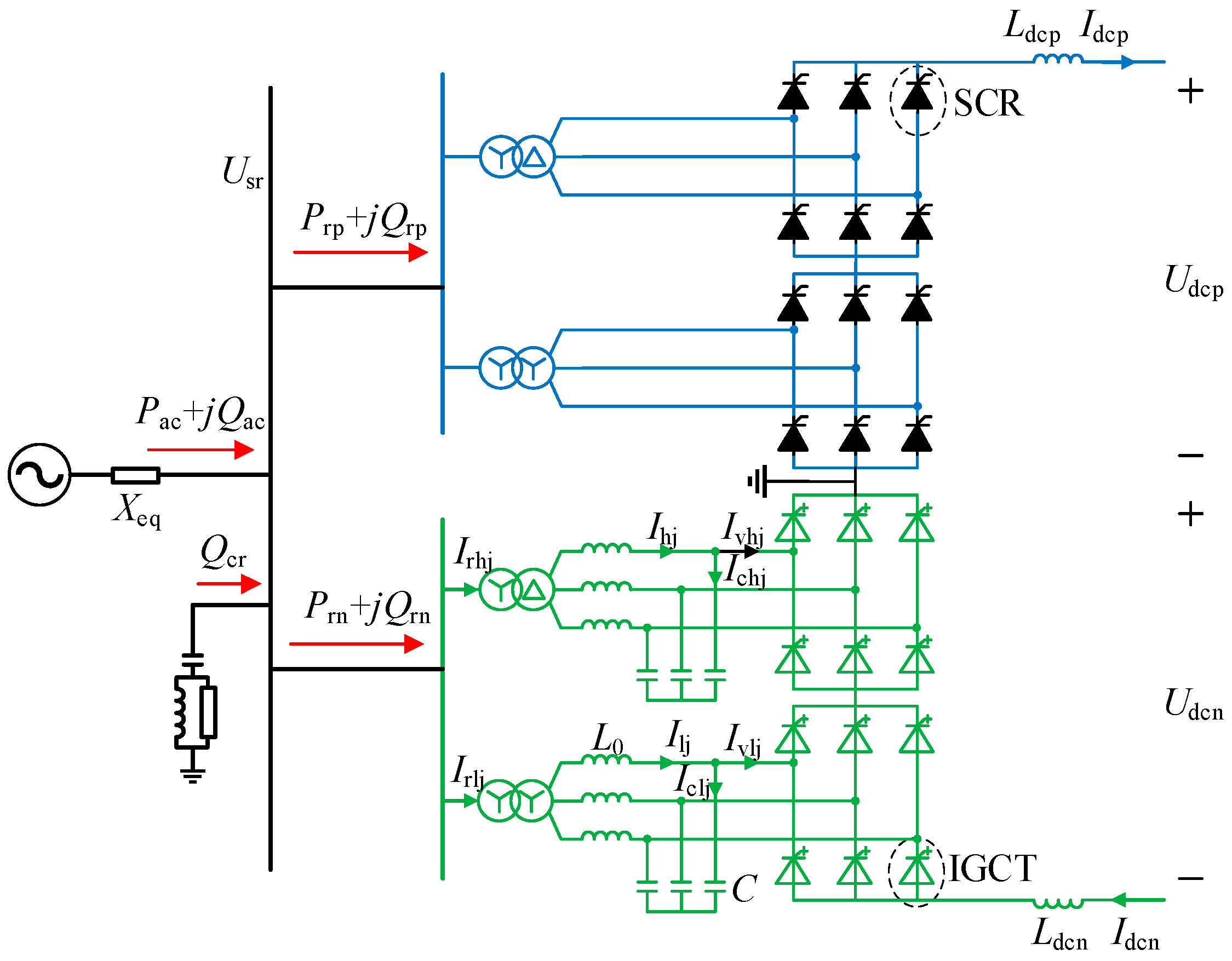 - Xu, C.; Yu, Z.; Zhao, B.; Chen, Z.; Wang, Z.; Ren, C.; Zeng, R. A Novel Hybrid Line Commutated Converter Based on IGCT to Mitigate Commutation Failure for High-Power HVdc Application. IEEE Trans. Power Electron. 2022, 37, 4931–4936. [Google Scholar] [CrossRef]