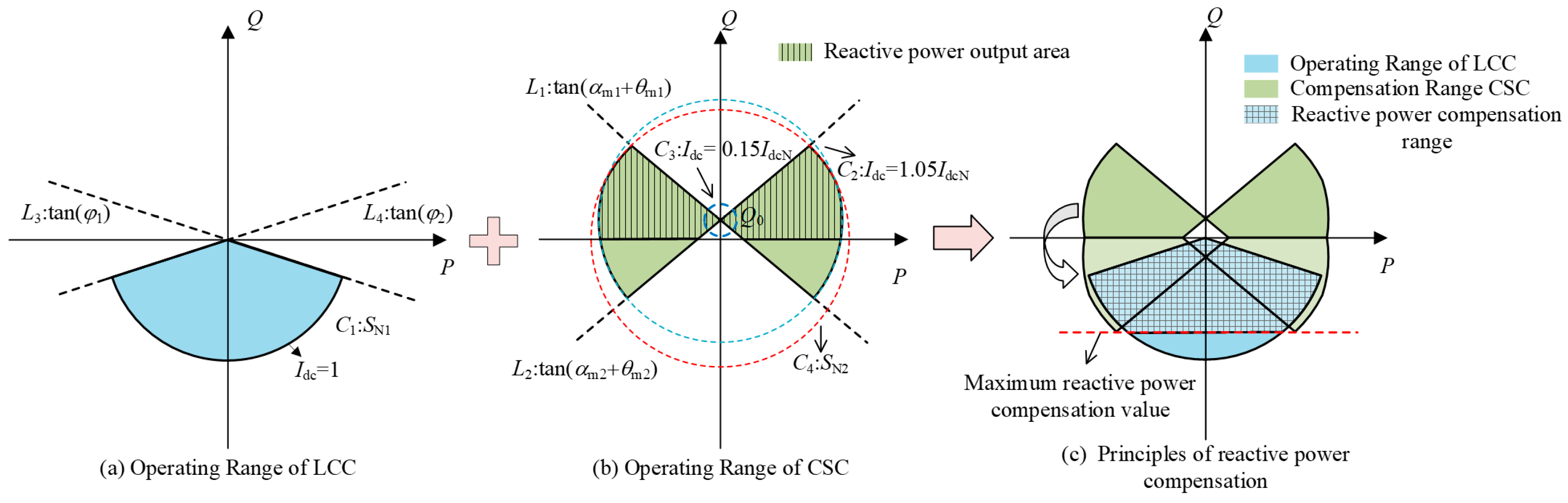 - Control Framework Novelty: This study reveals the power operating characteristics of the HCSC system. The power decoupling control and reactive power coordination control (RPCC) strategy enables real-time compensation of the reactive power demand of the LCC valve group, facilitates unity power factor operation of the HCSC system, minimizes the reactive power demand on passive filter devices, and reduces the physical footprint of the converter station.