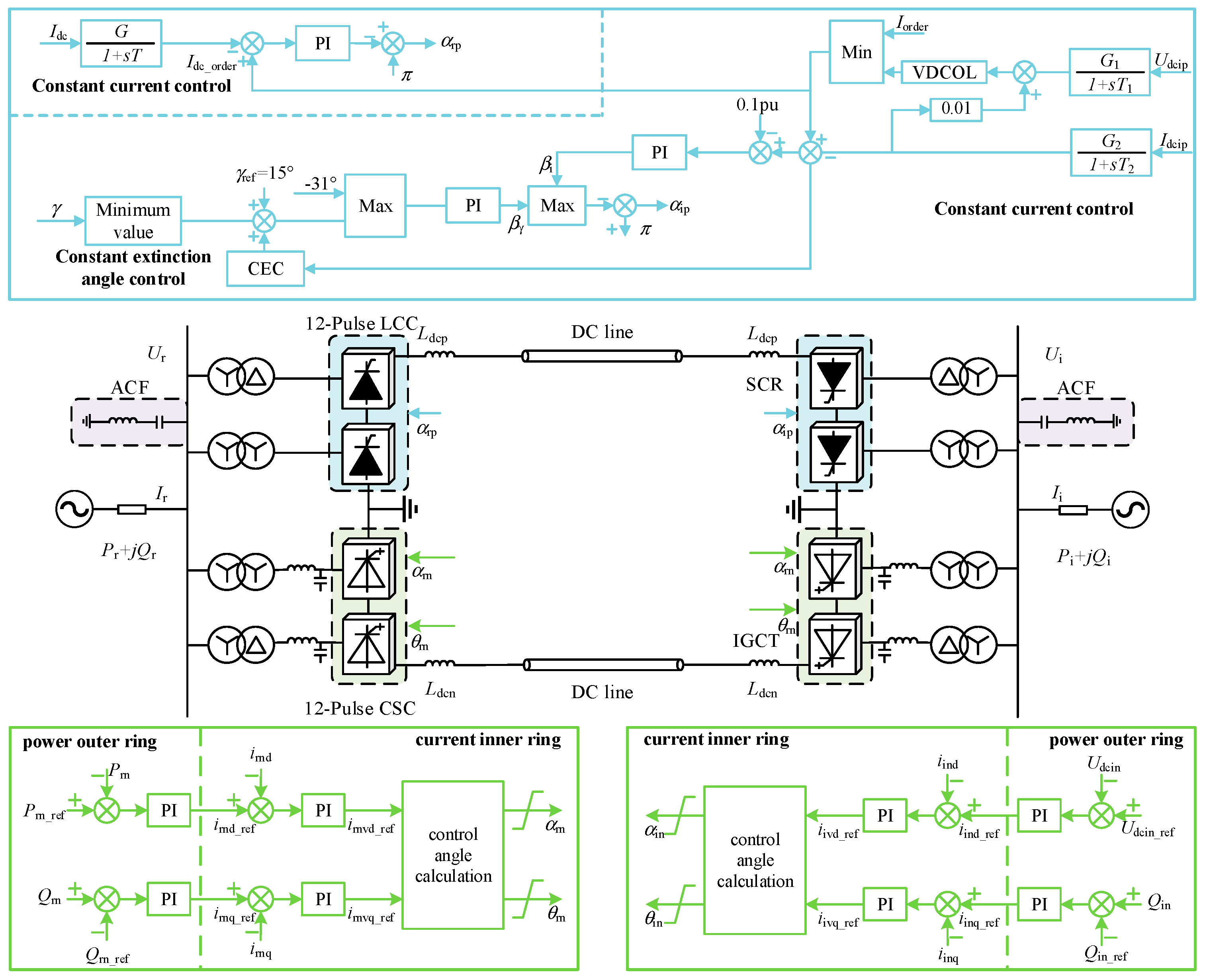 - Fu, S.; Xu, L.; Wang, Q.; Luo, Y.; Zhou, N.; Huang, P.; Lyu, Y.; Tang, Y. Dynamic Models for DC Fault Analysis of Actively Commutated CSC-HVDC under Different Grid Strengths. IEEE Trans. Ind. Electron. 2025, 73, 2300–2310. [Google Scholar] [CrossRef]
