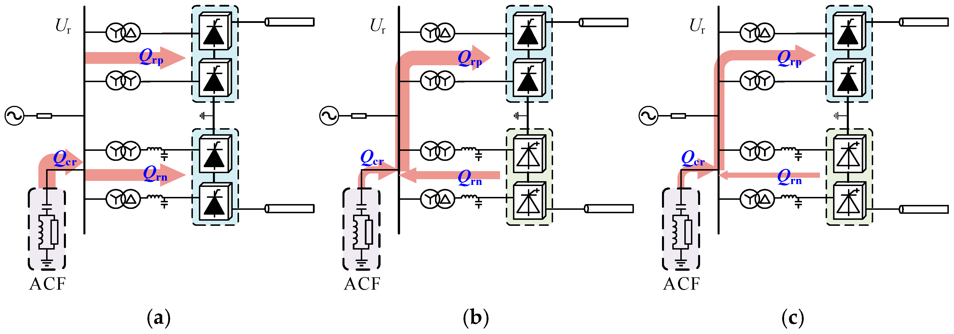 - Xie, Q.; Xiao, X.; Zheng, Z.; Wang, Y.; Song, D.; Du, K.; Zou, Y.; Zhang, J. An improved reactive power control strategy for LCC-HVDC to mitigate sending end transient voltage disturbance caused by commutation failures. Int. J. Electr. Power Energy Syst. 2023, 146, 108706. [Google Scholar] [CrossRef]