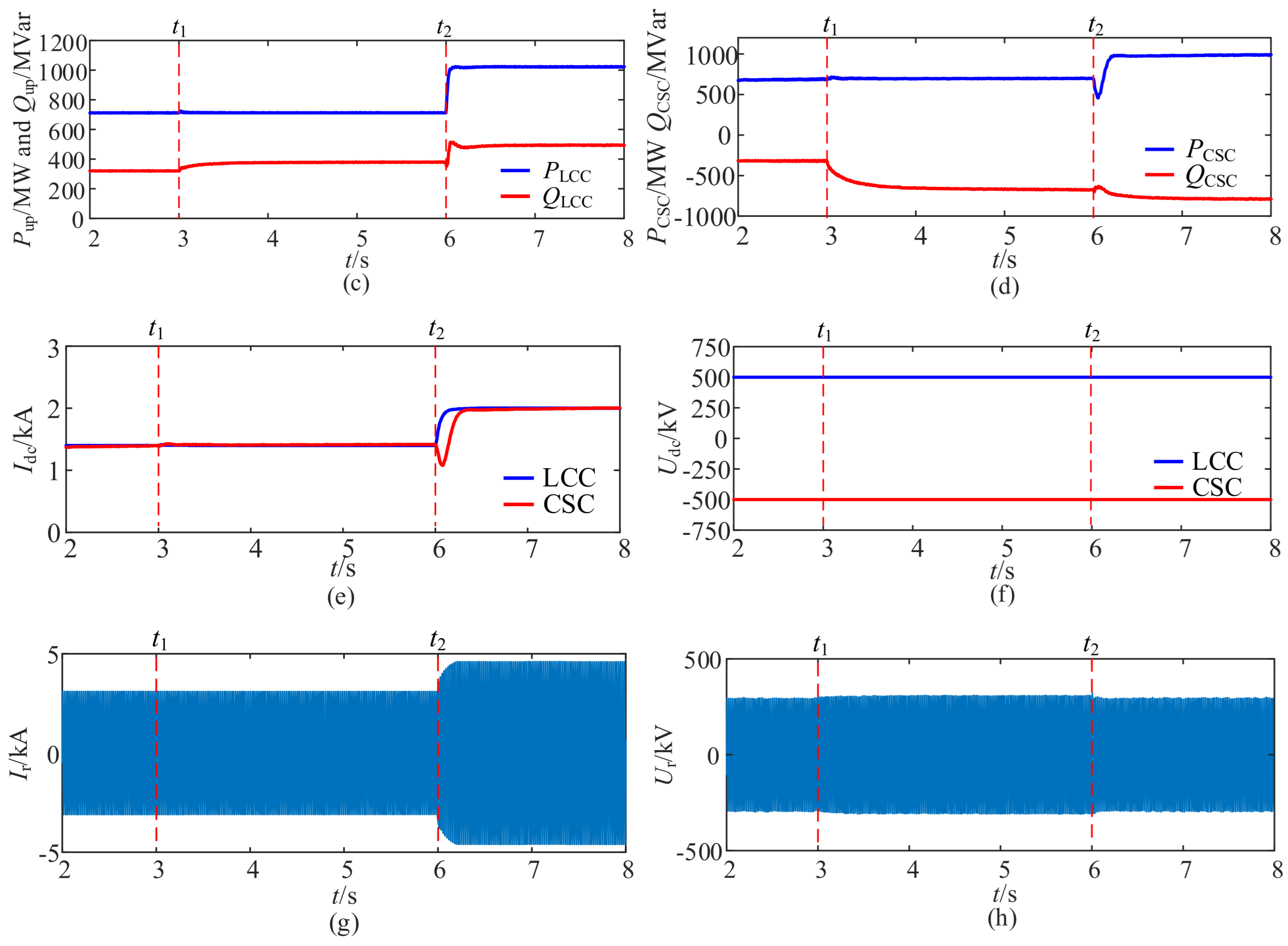 - The HCSC-HVDC system exhibits low reactive power compensation requirements and does not necessitate large-capacity reactive power compensation capacitors, thereby further reducing the high-voltage capacitor parameters by about 70.5% and enabling more compact and lightweight converter stations.