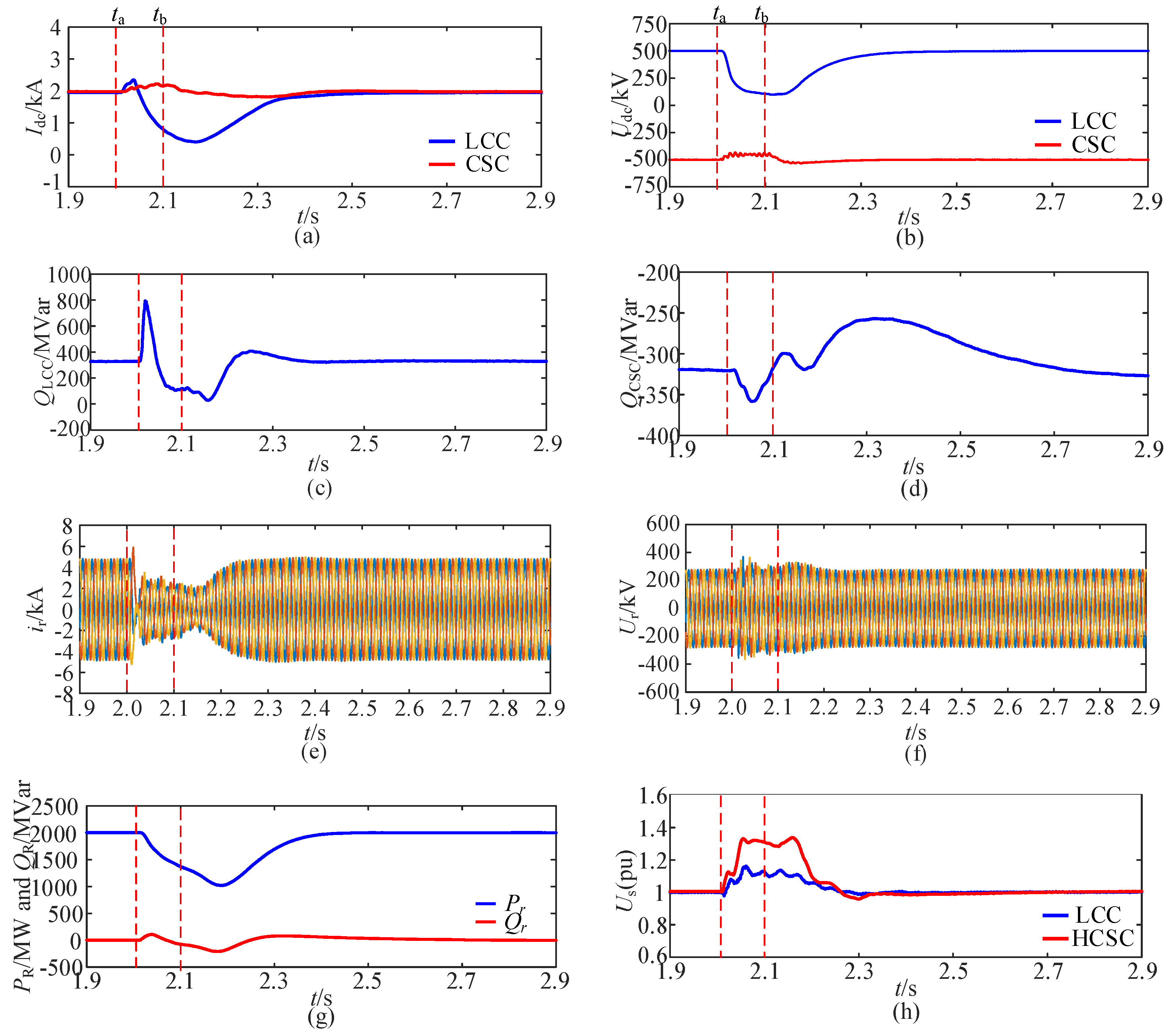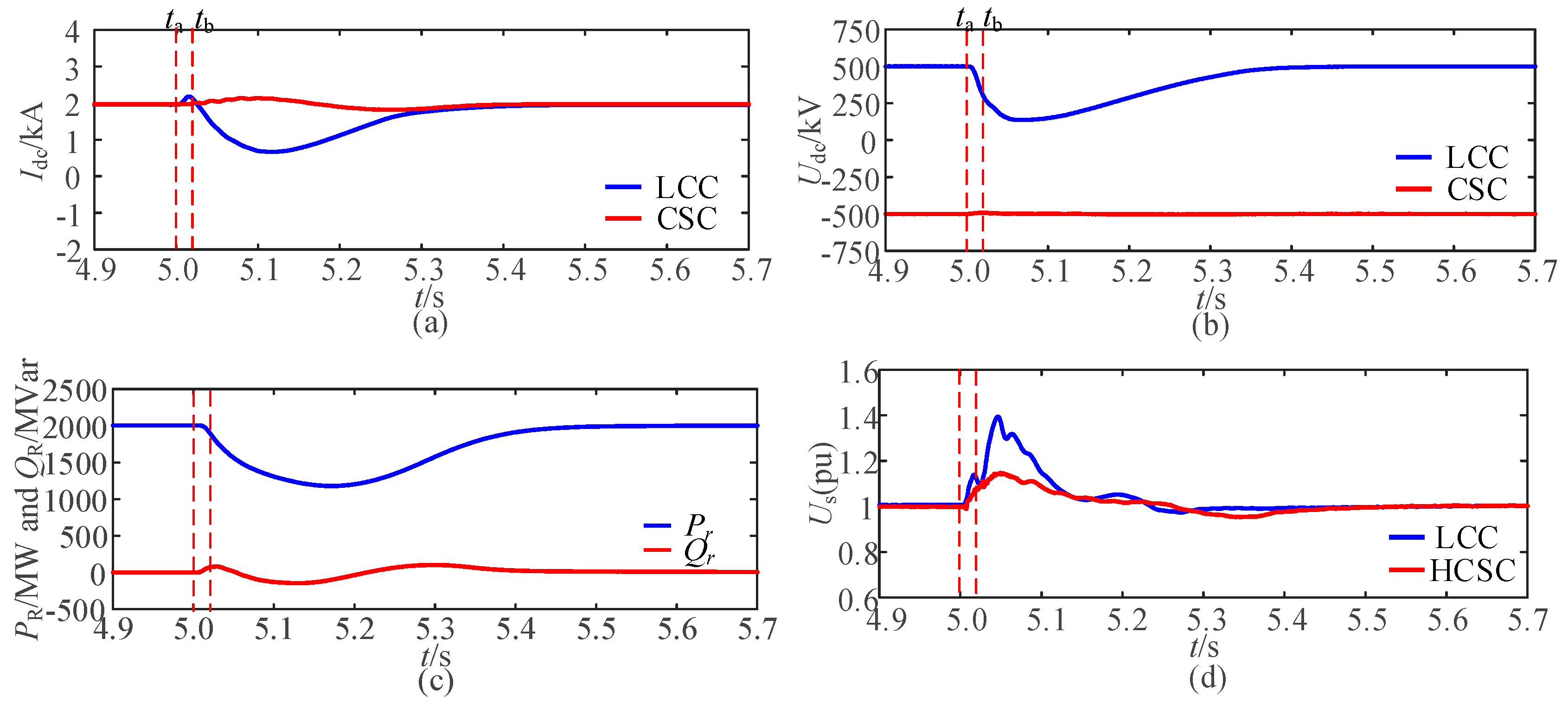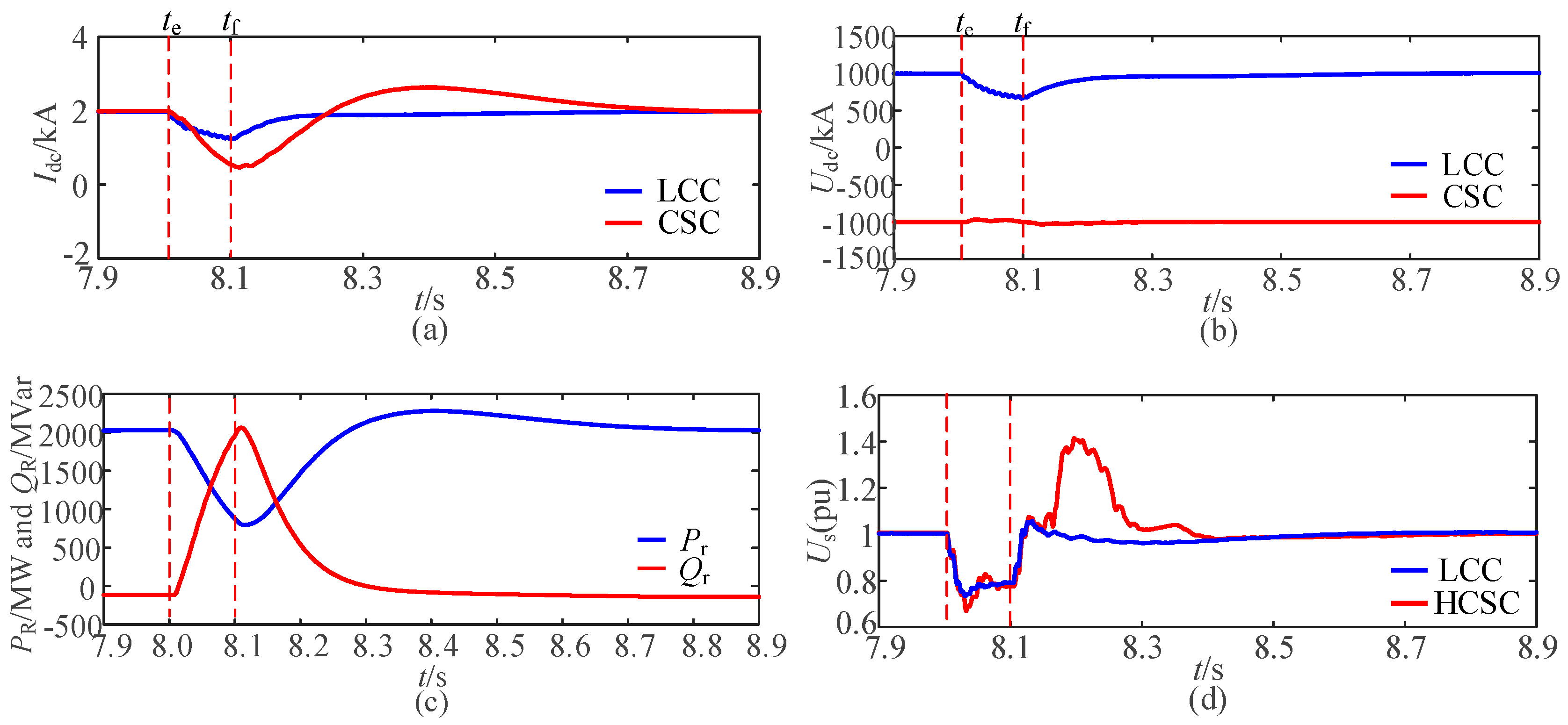 - The RPCC strategy based on power decoupling control provides fault ride-through capability under DC blocking faults and AC faults at both ends, and effectively mitigates the risk of transient overvoltage that conventional LCC-HVDC cannot withstand.