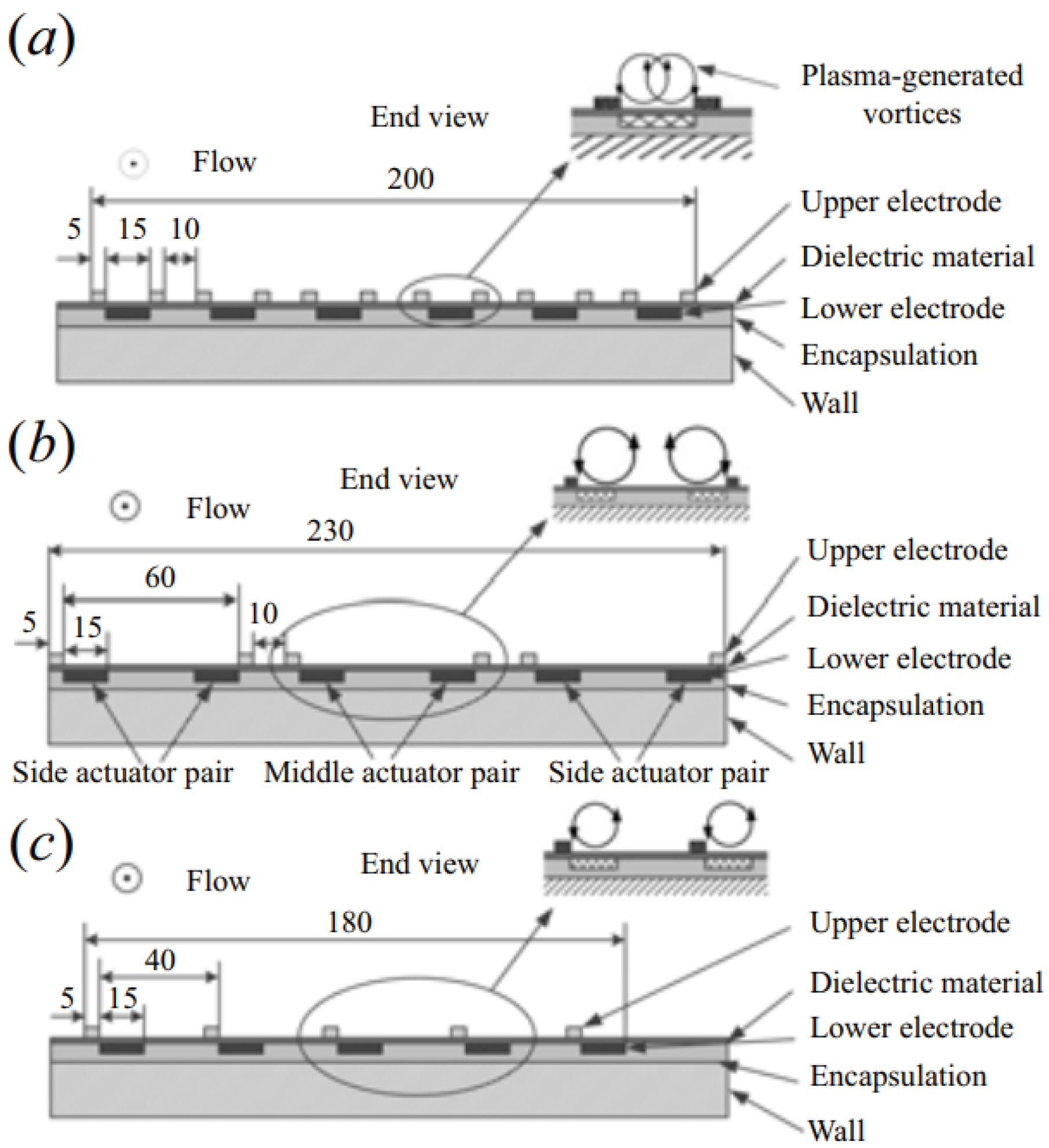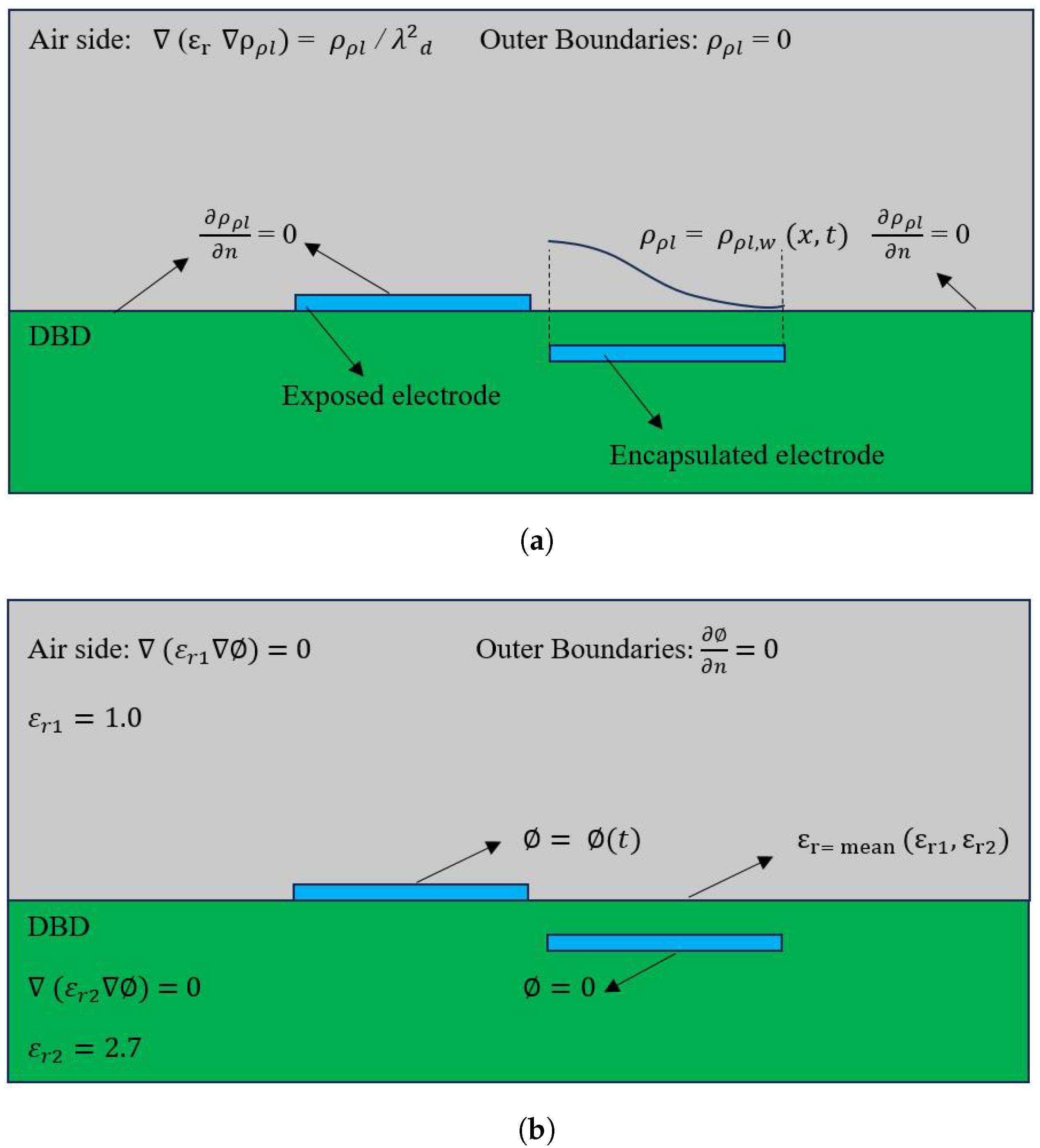 - In order to improve the PAs’ performance via the S-H model, the boundary conditions were modified, and, rather than following a Gaussian distribution [39,40], the PAs were modeled with a different boundary condition in which the charge density distribution on the electrode surface was proportional to the electric potential [54,111]. Compared to the Shyy model, the Suzen–Huang (S-H) model enabled the investigation of several additional parameters, including the permittivity of the DBD unit, electrode dimensions (thickness and length), Debye length, and gap between the electrodes.