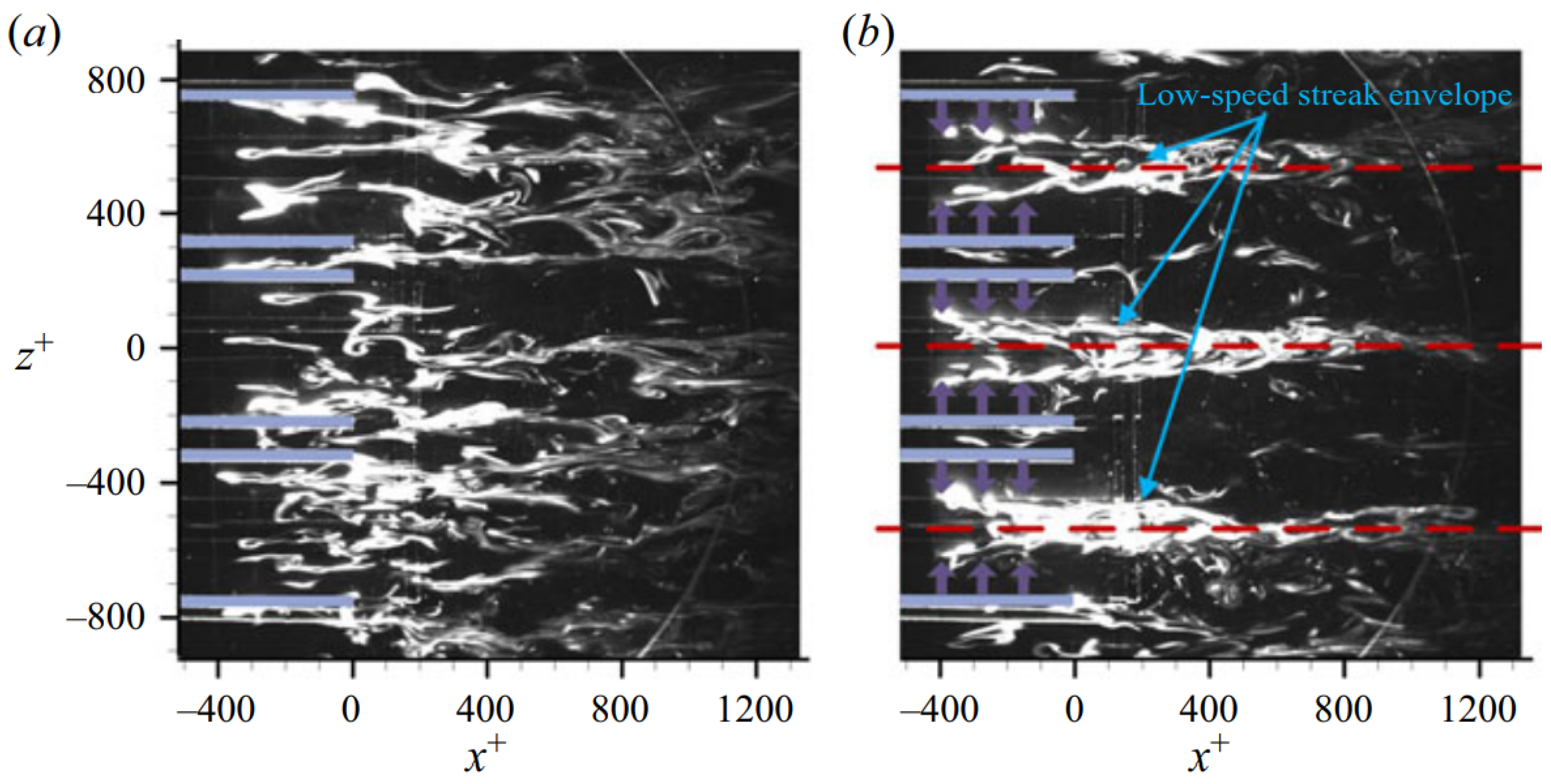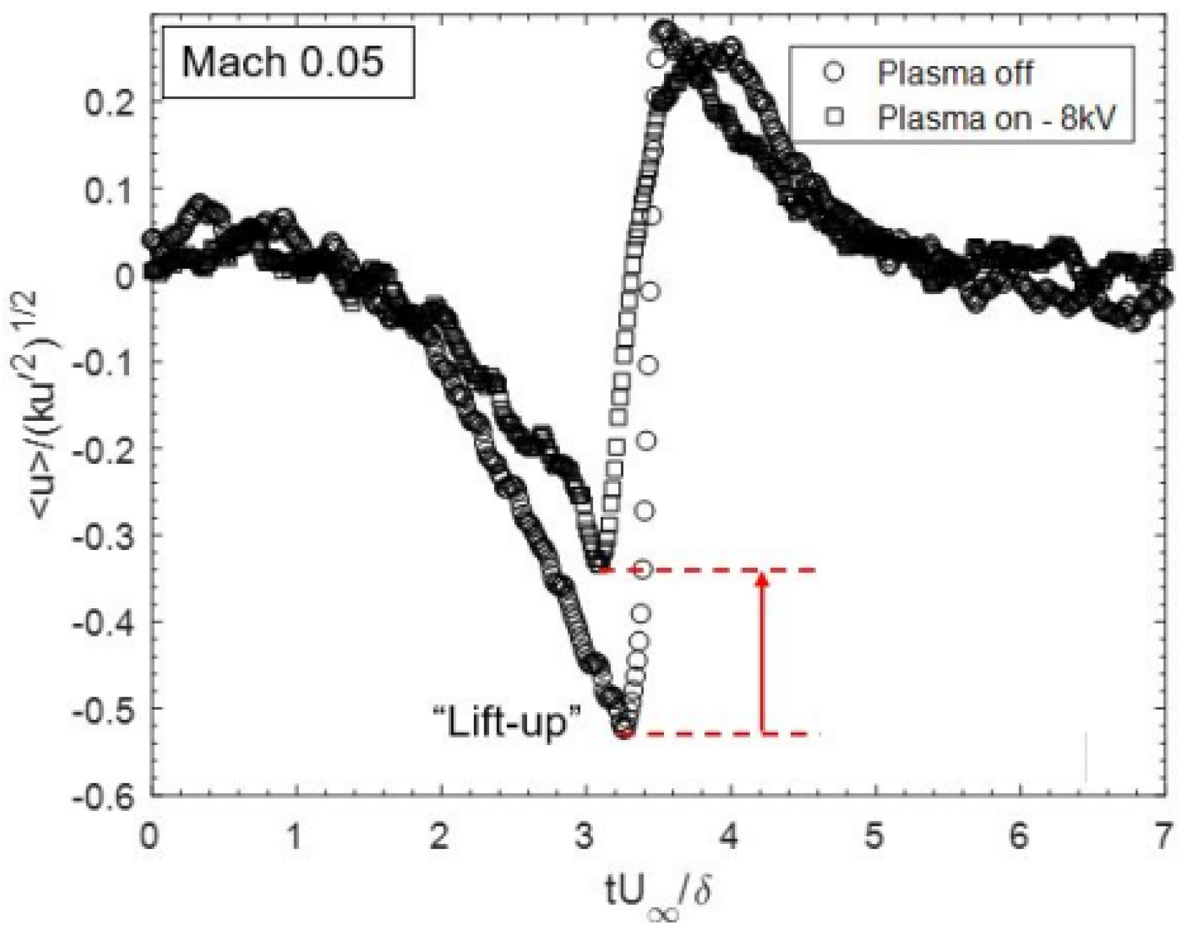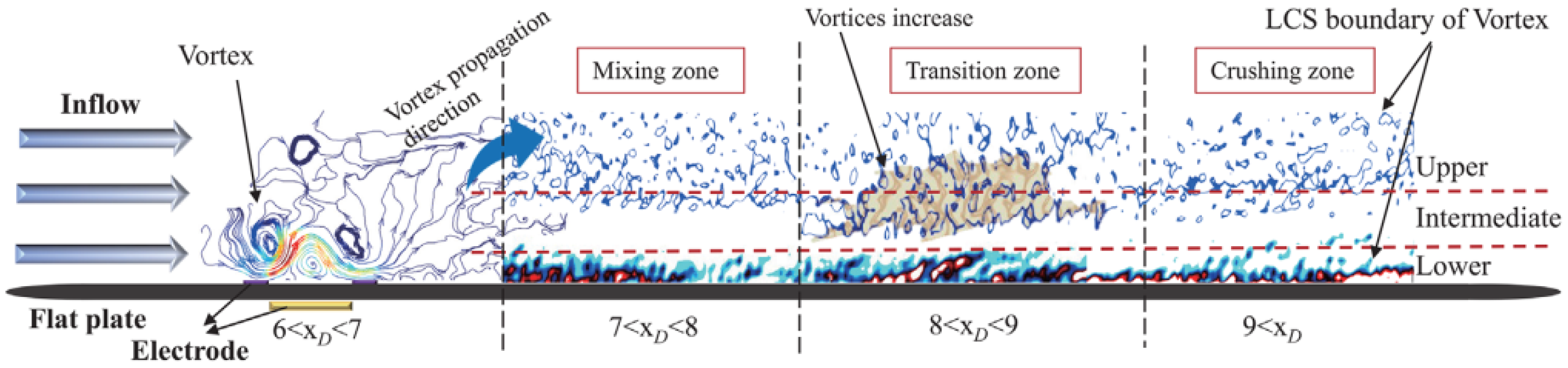 - In previous studies surrounding D-PA, the actuators were implemented to produce a spanwise near-wall flow of sufficient magnitude to inhibit the lift-up of the near-wall streaks, resulting in drag reduction at high wind speeds. The degree of the drag reduction highly depended on two parameters, , , and the optimum value of both parameters ( and ) was found to vary with the applied voltage. The first parameter describes the non-dimensional distance between electrodes and characterizes how many near-wall streaks can be controlled, which indicates the overall potential to reduce drag. The second one describes the level of spanwise plasma-induced flow required relative to the local friction velocity. The lift-up of the low-speed streaks gave rise to a flanking wall-normal vorticity (). The high level of is critical for streaks’ transient growth within the boundary layer. Regardless of the D-PA configuration considered, when applying an optimal and optimal excitation parameters, the streak lift-up at high Reynolds numbers was suppressed.
