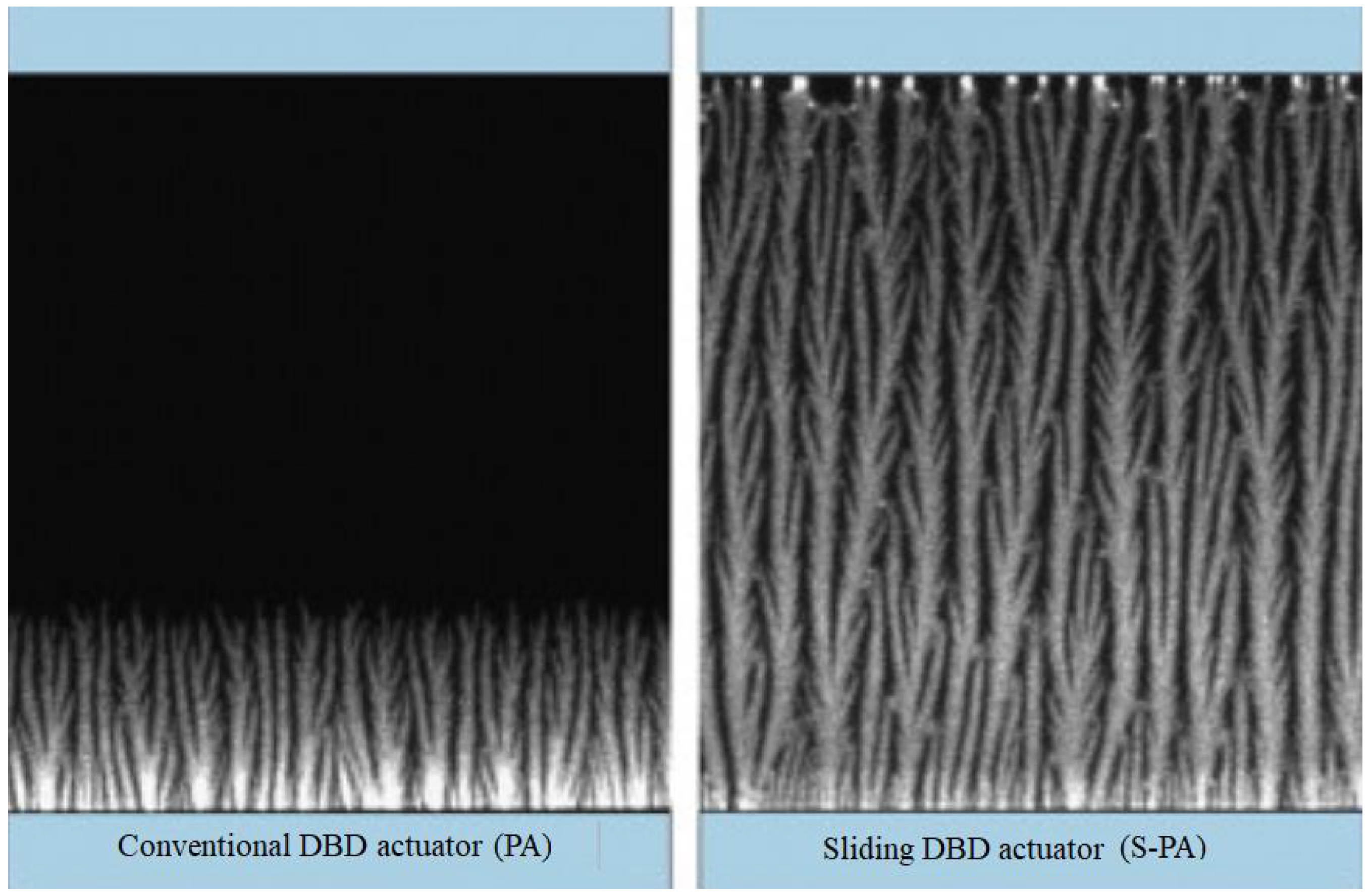 - In conventional plasma (asymmetric DBD actuators), the DBD unit produces very high power peaks, which may induce problems of electromagnetic hazards. Consequently, researchers began to focus on developing actuators that can achieve a more stable discharge [88]. Turning to the S-PA configuration led to a more homogeneous plasma with DC < 0 and a higher induced velocity than the typical DBD (PA). In S-PA, the application of a positive DC voltage component (VDC > 0) did not significantly change the DBD current. The velocity of the electric wind created by the three-electrode S-PAs with VDC > 0 is always greater than when VDC < 0. As such, to increase the velocity of the ionized wind, a positive DC voltage has to be applied to the downstream exposed electrode. These actuators changed the direction of the flow downstream in the boundary layer.