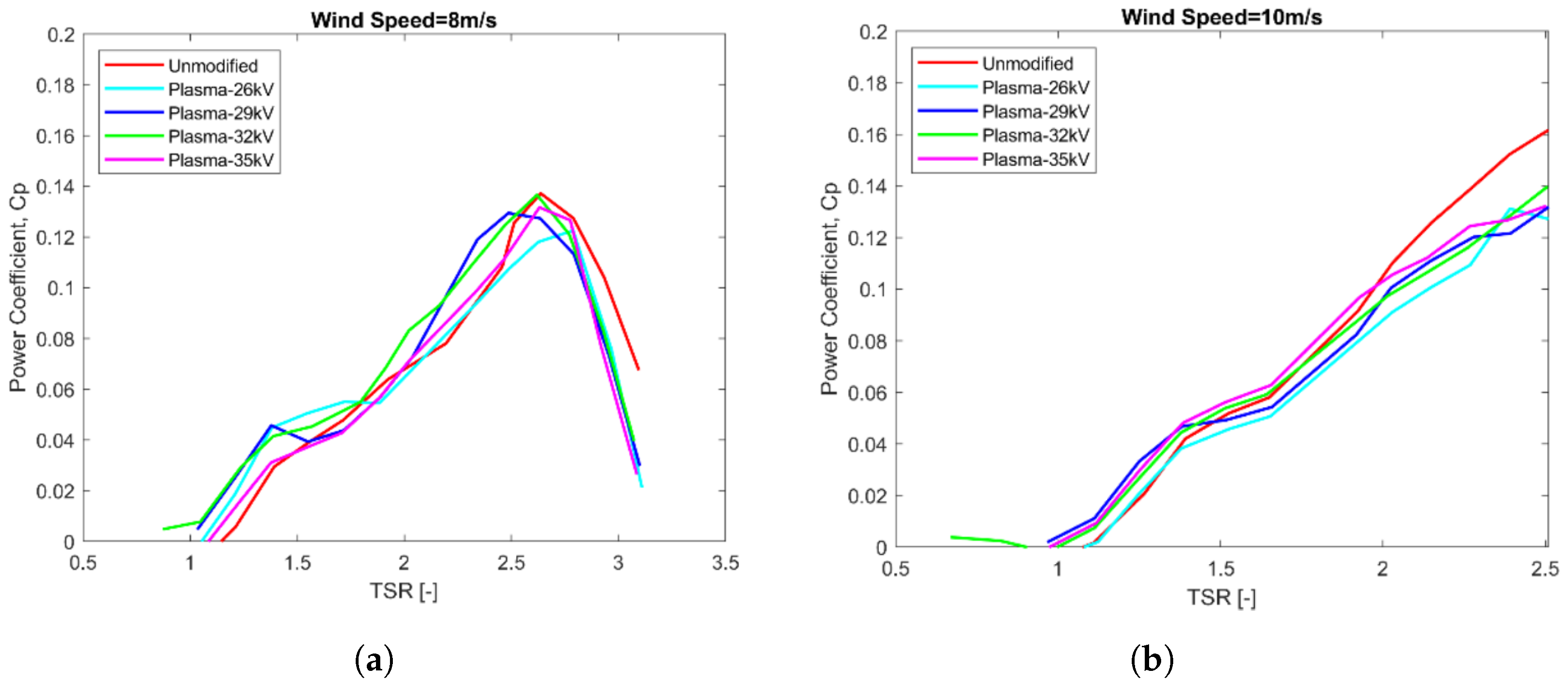 - Redesigning large turbines by combining PAs with devices such as Microtabs or CGF placed at a particular spanwise location near the blade tip, significantly reduced the DEL and improved the LCOE, particularly at wind speeds ≤ 9.8 m/s [149,152,154]. To properly implement PAs with CGF, a control system [154] or a gust alleviation controller [155] were required. In addition, the S-H model as a phenomenological method, successfully enhanced the aerodynamic performance across both small [156], and large scale [146] HAWTs, also contributing to a reduction in DEL [149,152,155]. Modifying the boundary condition for the charged surface, proposed as an alternative to the commonly used Gaussian distribution in this model [54], outperforming the Shyy model, specially at high wind speeds (10 and 12 m/s).