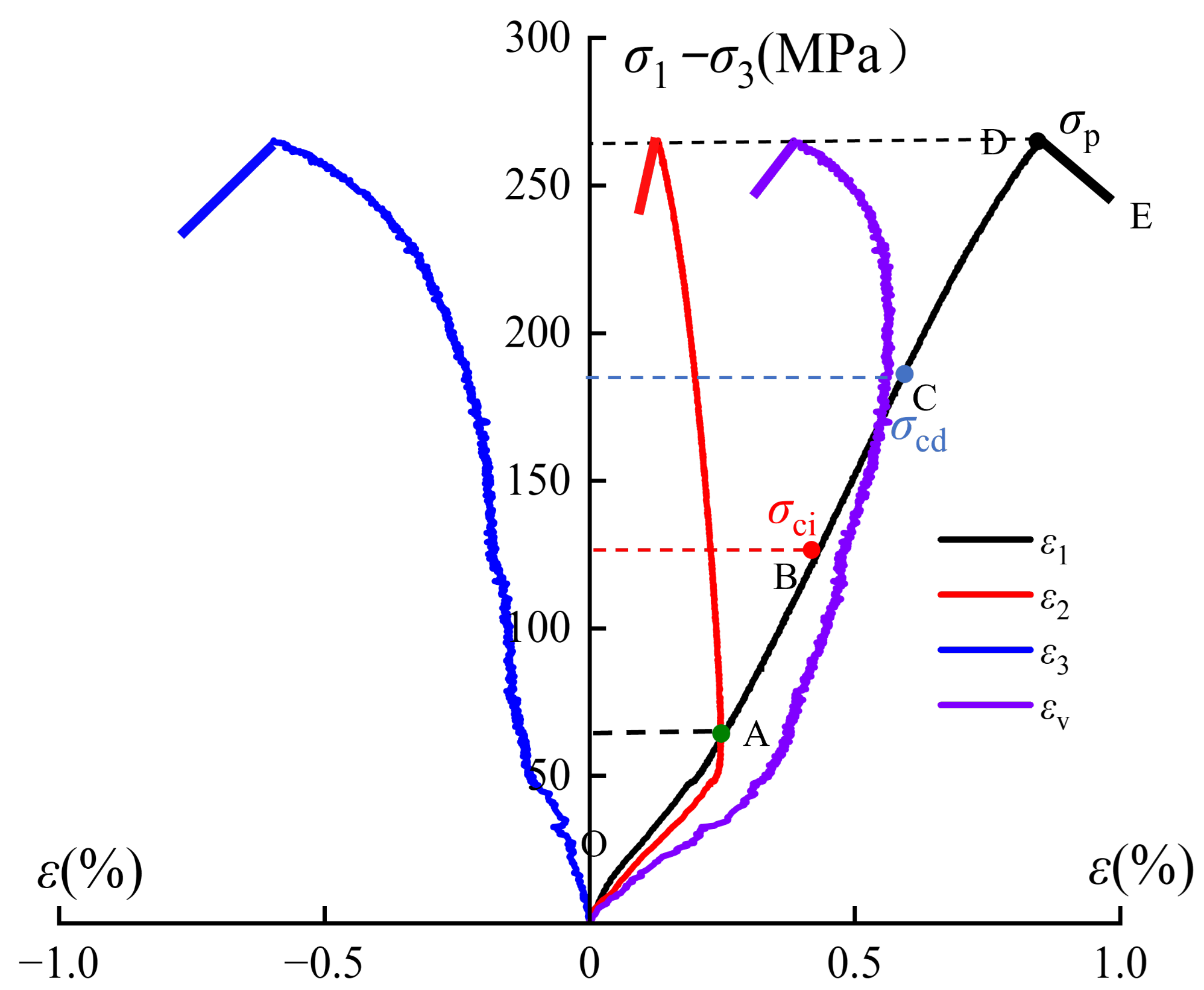 - Elastic deformation (AB): With increasing load, the stress–strain relationship becomes approximately linear, indicating that the internal structure of the specimen remains essentially intact. When the applied stress reaches the crack initiation stress at point B, new microcracks begin to nucleate and propagate.